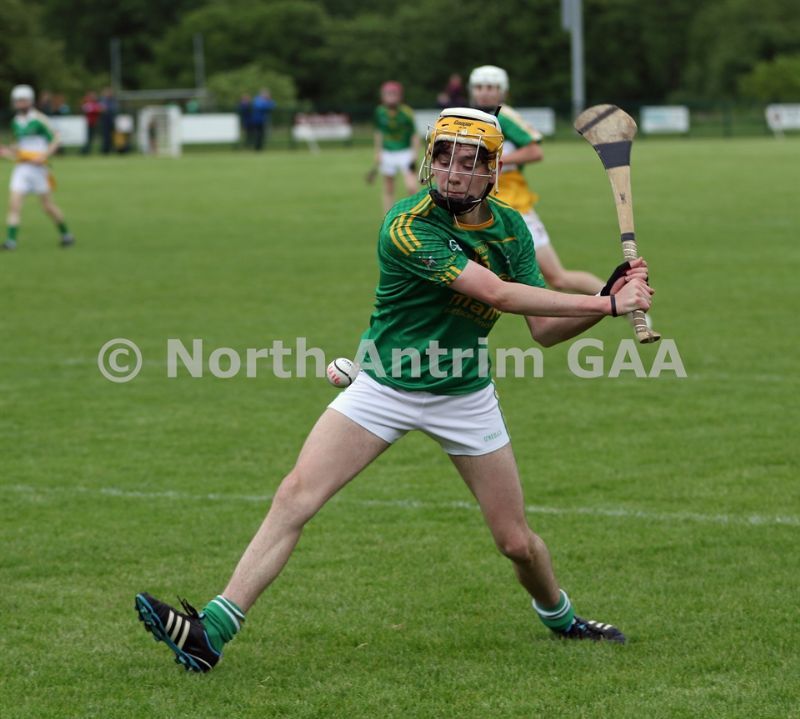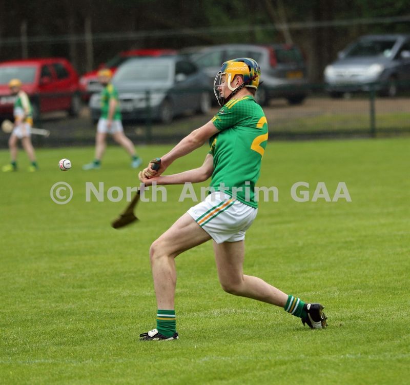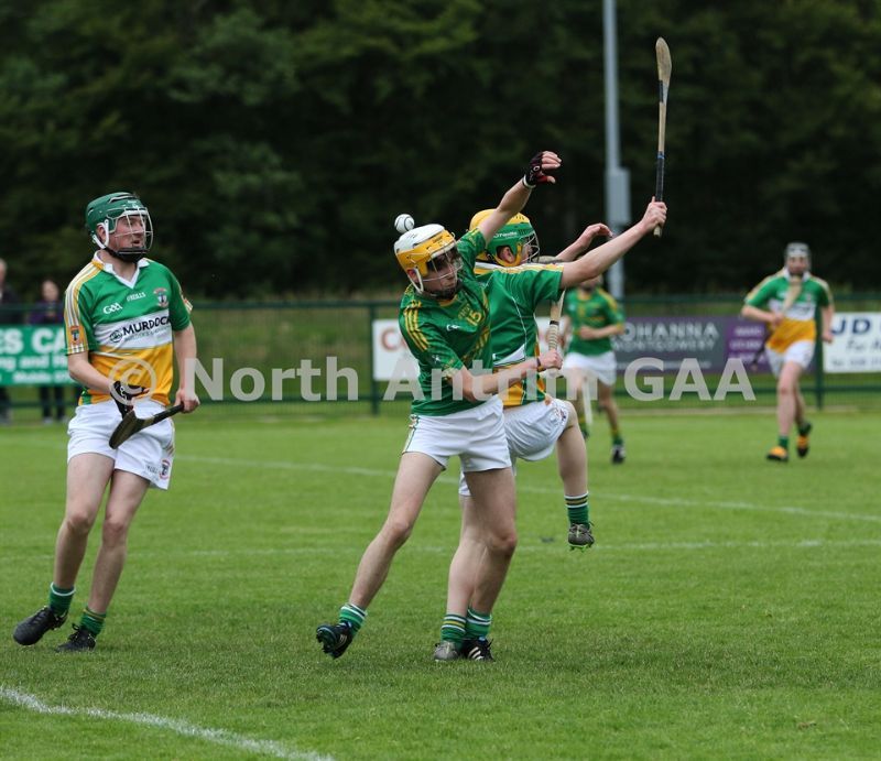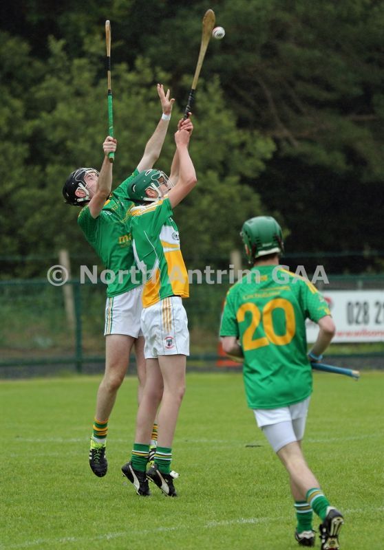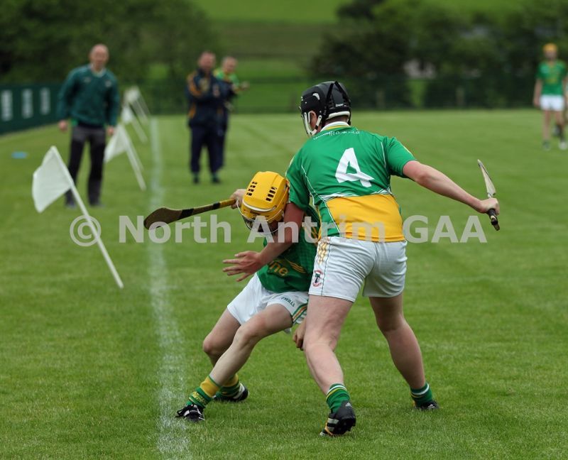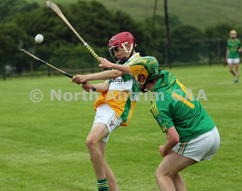 • North Antrim GAA Chairmain Owen Elliott presenting McMullan Cup Final Captain Aaron Crawford with the McMullan Cup Final Trophy