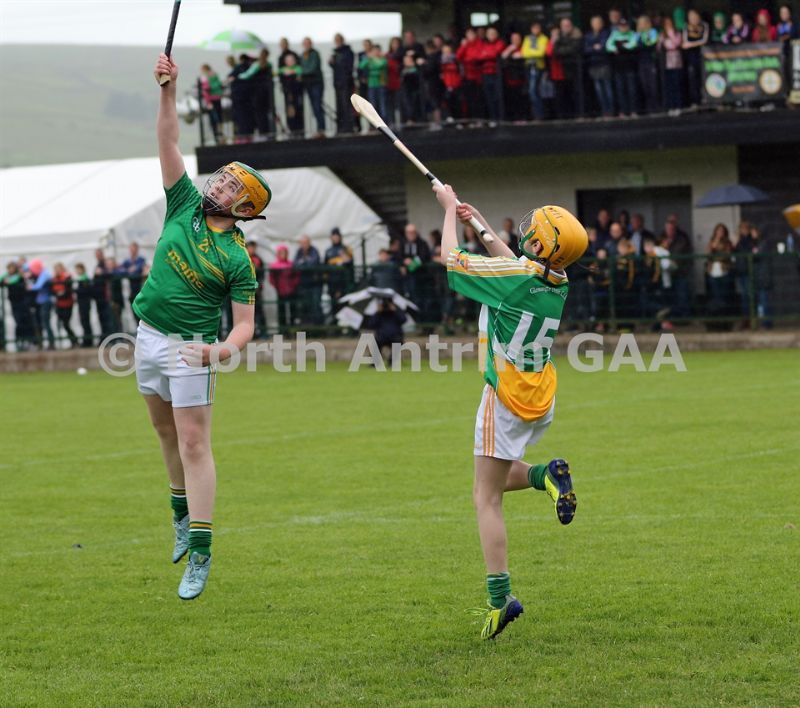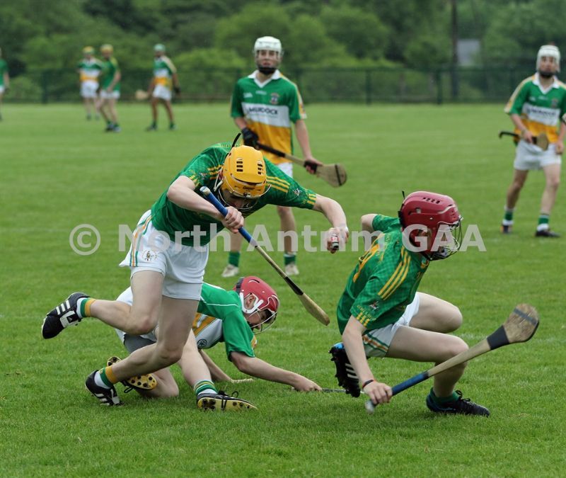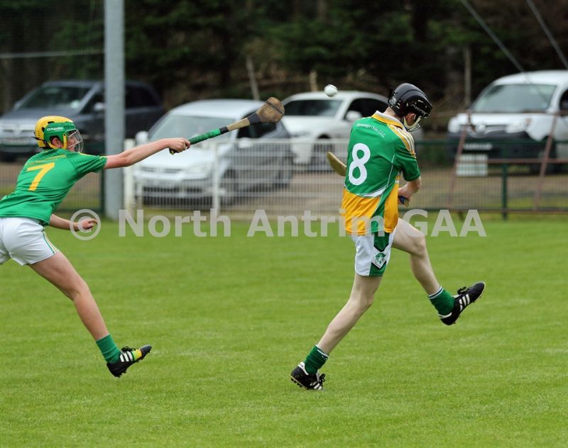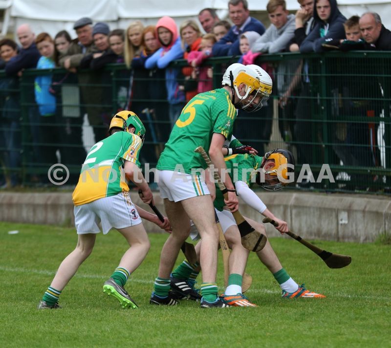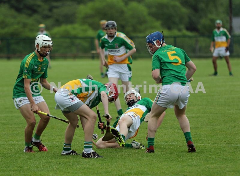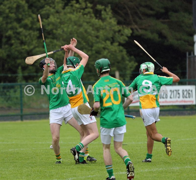 • North Antrim GAA Chairmain Owen Elliott presenting McMullan Cup Final Captain Aaron Crawford with the McMullan Cup Final Trophy