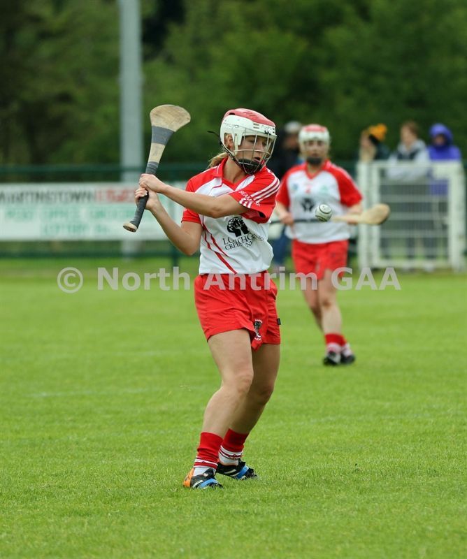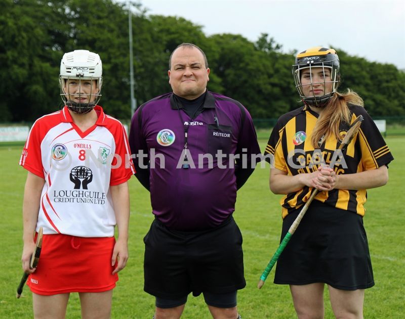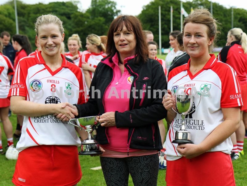 • Antrim Camogie Vice Chairman presenting Senior Feis Camogie Final Captain Charlene Campbell with the Senior Feis Camogie Trophy and Emma McMullan with player of the match