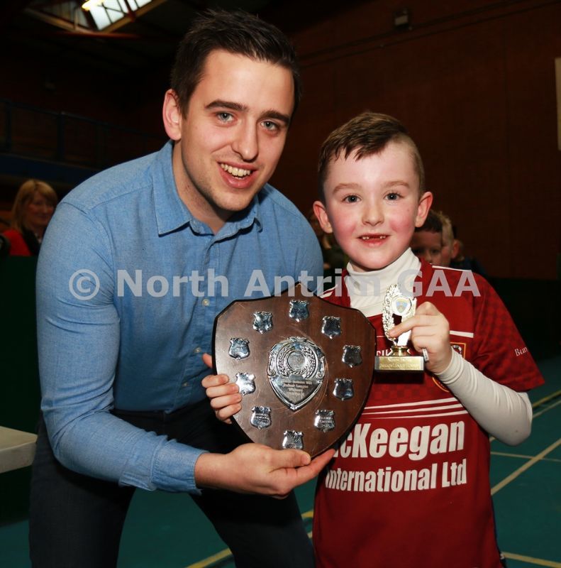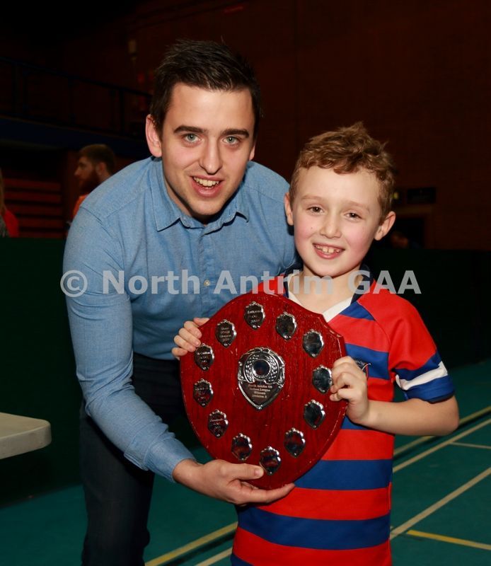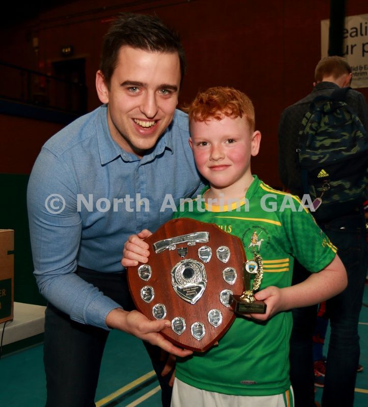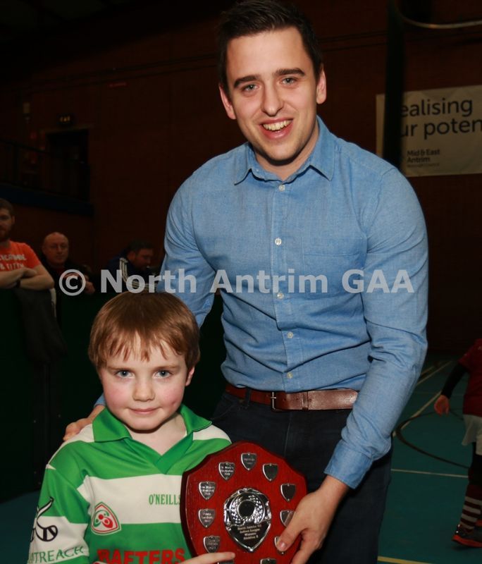 • Aaron McHenry from Central Restaurant Ballycastle presenting Ruairi Og Cushendall team captain Jake Laffan with the Central Restaurant U8 Indoor Hurling Division 4 Shield