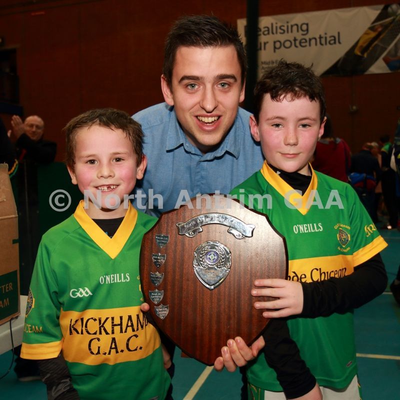 • Aaron McHenry from Central Restaurant Ballycastle presenting Kickhams Creggan joint team captains Ronan Colgan and Domhall McKay with the Central Restaurant U8 Indoor Hurling Division 1 Shield