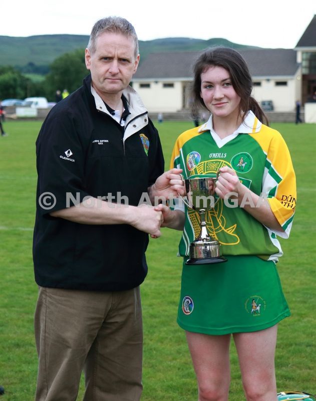 • North Antrim GAA Chairmain Owen Elliott presenting Cuchullians Dunloy captain Katie Laverty with the U16 Feis Camogie Trophy