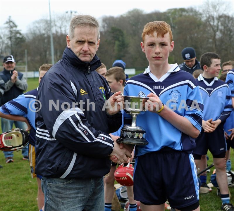 • North Antrim GAA Chairmain Owen Elliott presentring St McNissi captain Ciaran McGill with the North Antrim U14 Feile B Trophy