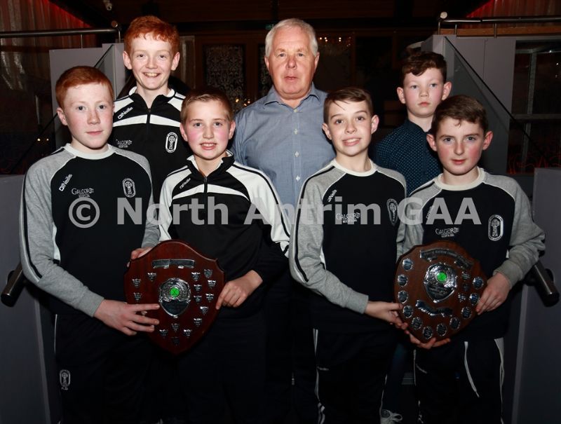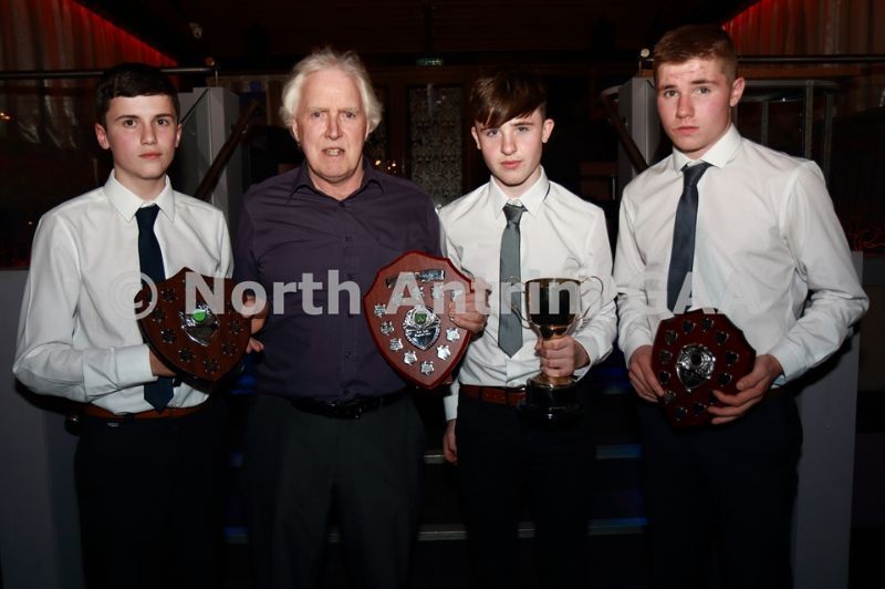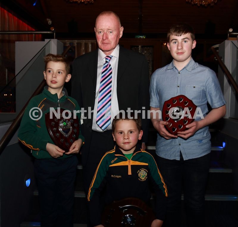 • North Antrim County Delegate Sean McKendry with Loughgiel juvenile players who received awards at the North Antrim dinner. L,R, Rory McCormick (U14 Airbourne), Cathal Hargan (U16 League), Michael McGarry (U16 Championship), Daniel O’Mullan (U10 Indoor)