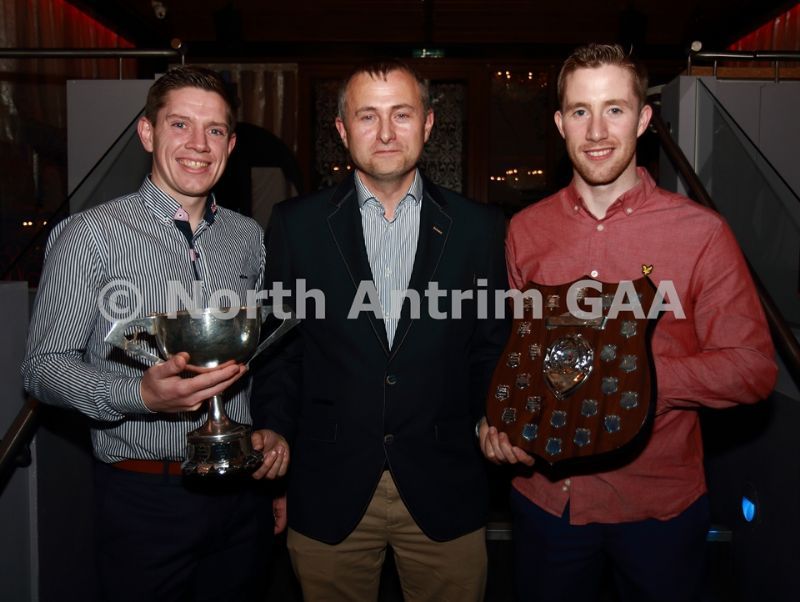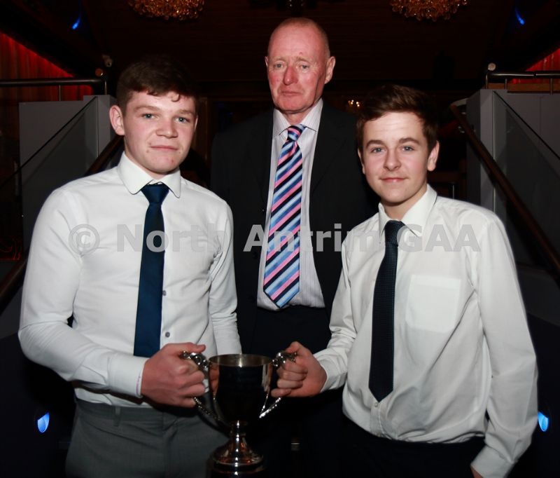 • North Antrim Secretary Frank McCarry presents the Junior Feis Cup to Sean Ward (left) and North Antrim Junior Hurler of the Year award to Darren Hamill of Glenarm