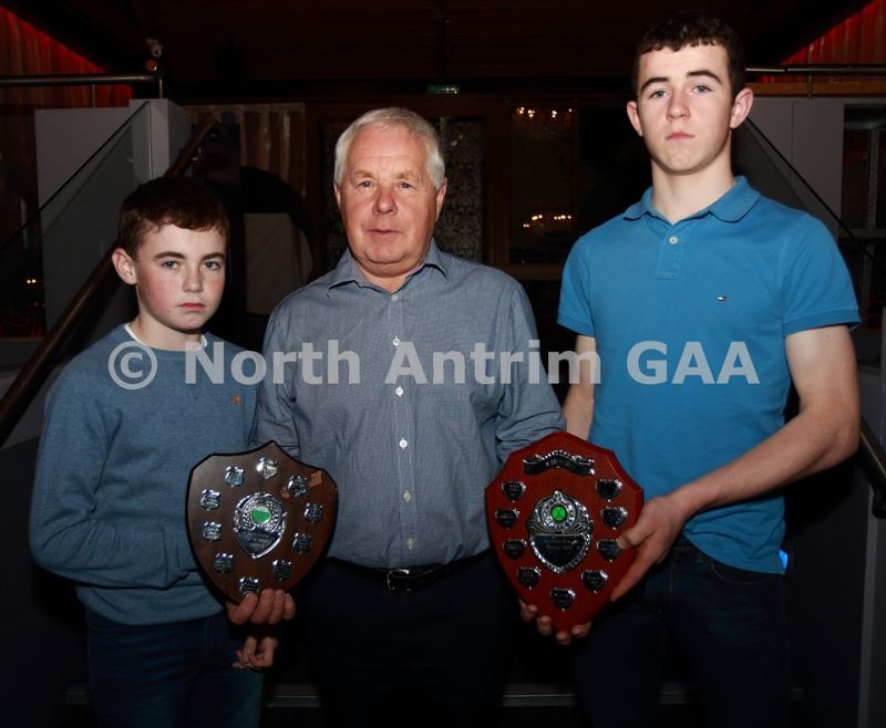 • North Antrim Treasurer Chris Campbell presents the North Antrim Under 14 B Championship trophy to Niall McGarrell (left) and the Under 14 Division 2 League trophy to Aidan Scullion, both of Glenarm Shane O’Neill’s