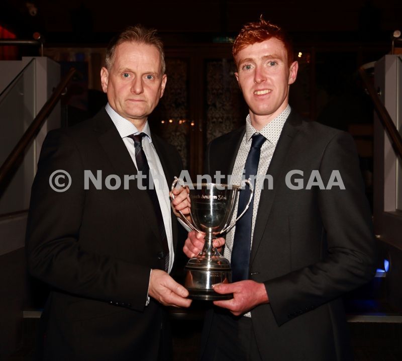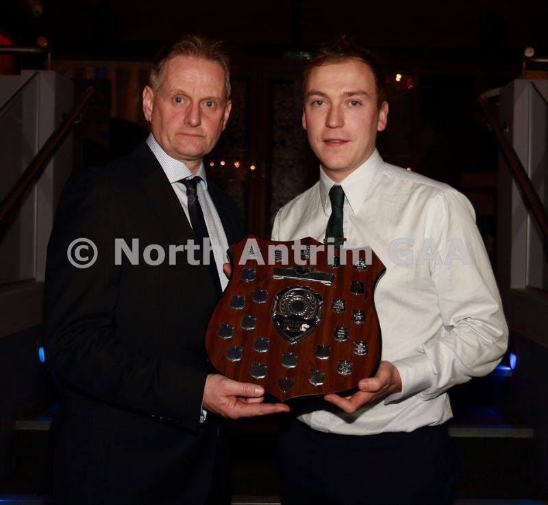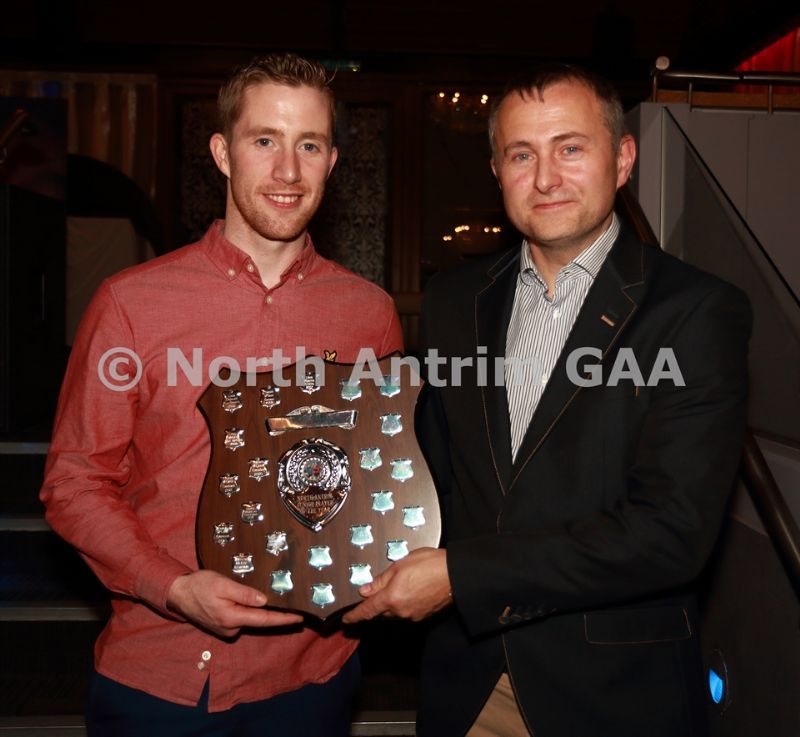 • North Antrim Chairman Owen Elliott presents the North Antrim Intermediate Hurler of the Year award to James ‘Rocket’ Black of Carey Faughs