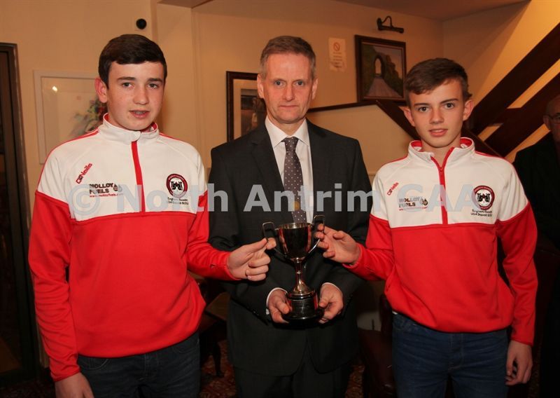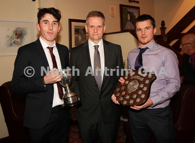 • North Antrim Chairman Owen Elliott presents the North Antrim Intermediate Hurler of the Year to Conor Small and the North Antrim Junior Hurler of the Year to Declan McKay