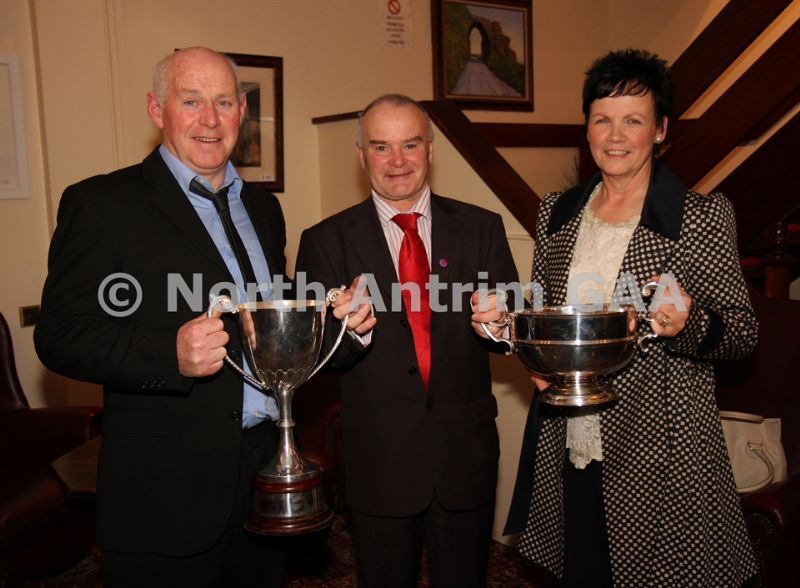 • Antrim County Vice-Chairman Joe Edwards presents the Antrim and Ulster Intermediate Hurling Championship Cups to Tommy and Mary McCann of Creggan Kickhams