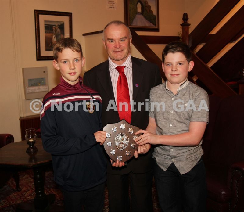 • Former North Antrim Treasurer Harry Connolly presents the Under 12 Championship cup to Oisins captain Shea McDonnell and the Under 10 Championship Cup to Patrick McIlwaine