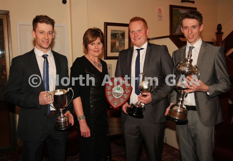 • North Antrim Secretary Mary Kane presents Loughgiel Shamrocks trio Nicholas McNaughton (left) with the Reserve Championship Cup, Damian Gillen with the North Antrim Junior League and McCaughan Cup and James McNaughton with the Alister McAlister Cup