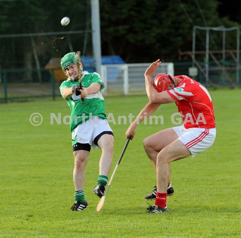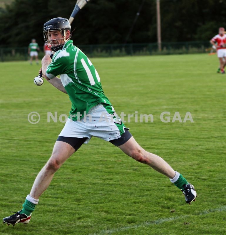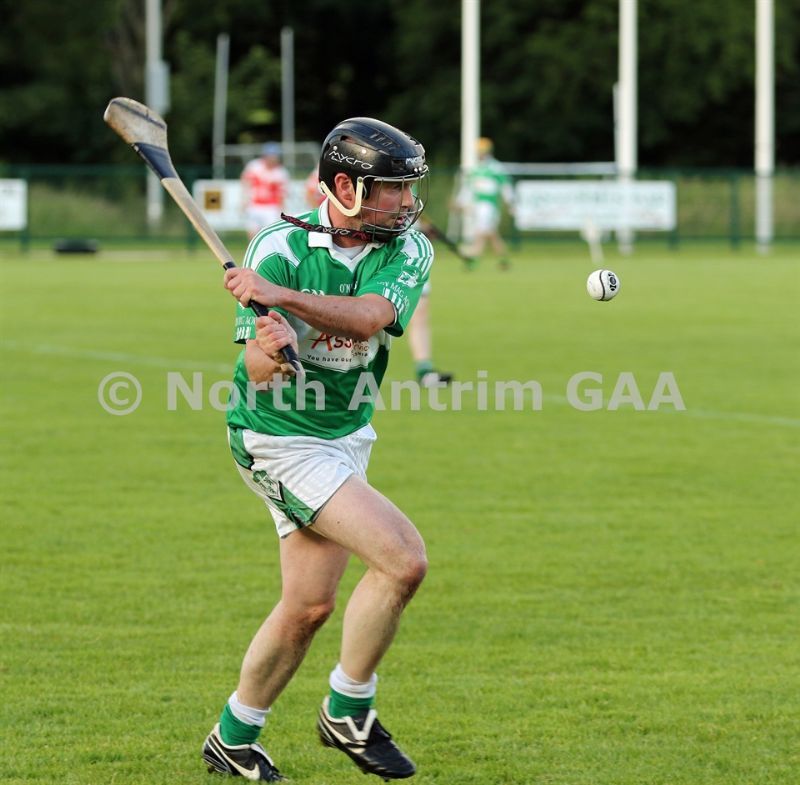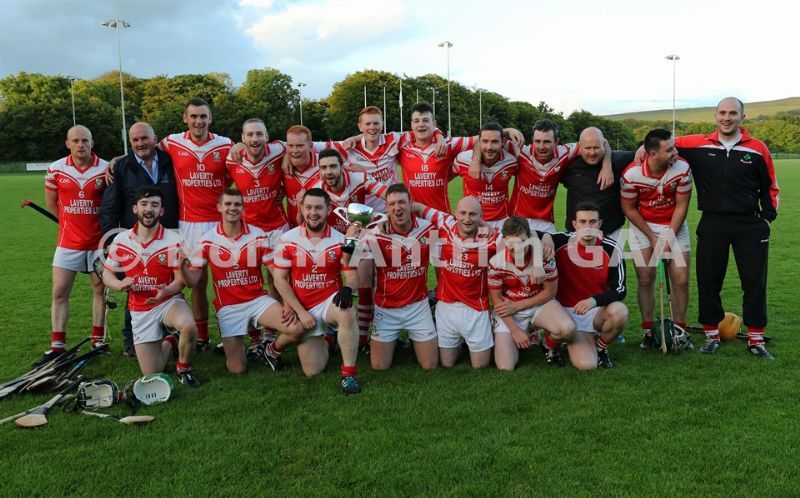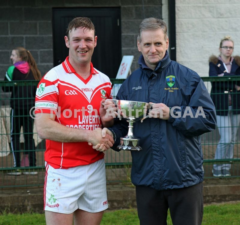 • North Antrim GAA Chairmain Owen Elliott presentring Loughgiel Shamrocks Captain with the Junior Feis Hurling Shield Trophy