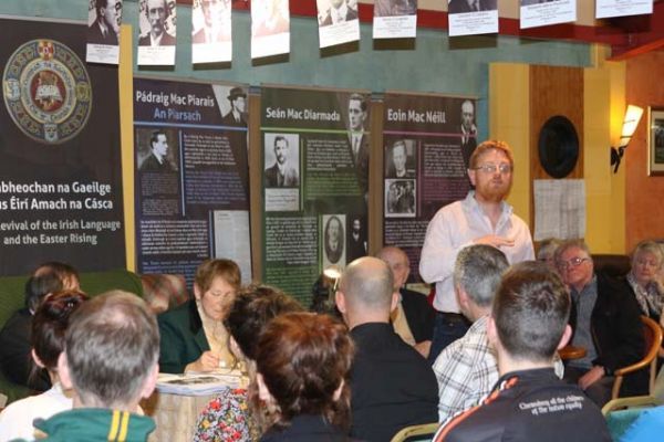 The evening began with a chance to examine the Conradh na Gaeilge Exhibition - Athbheochan na Gaeilge agus Éirí Amach na Cásca (The Irish Language Revival and the Easter Rising). Seán Ó Murchadha, from Conradh na Gaeilge, spoke to the audience about the display.