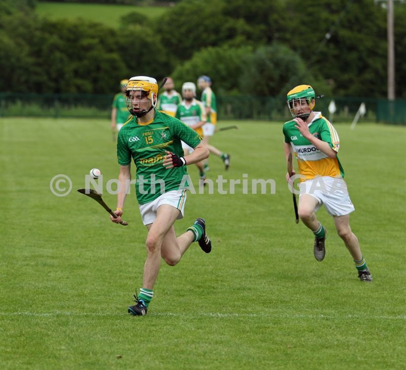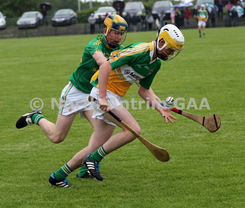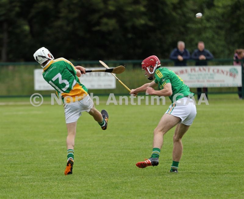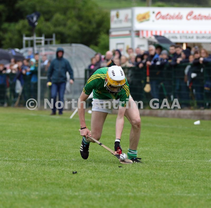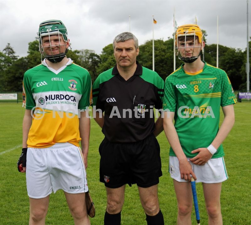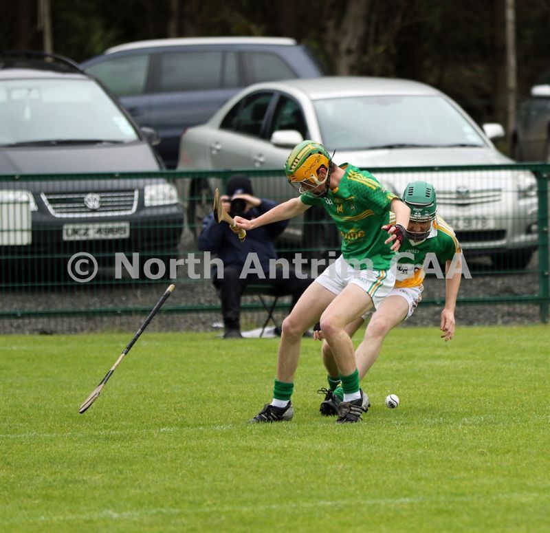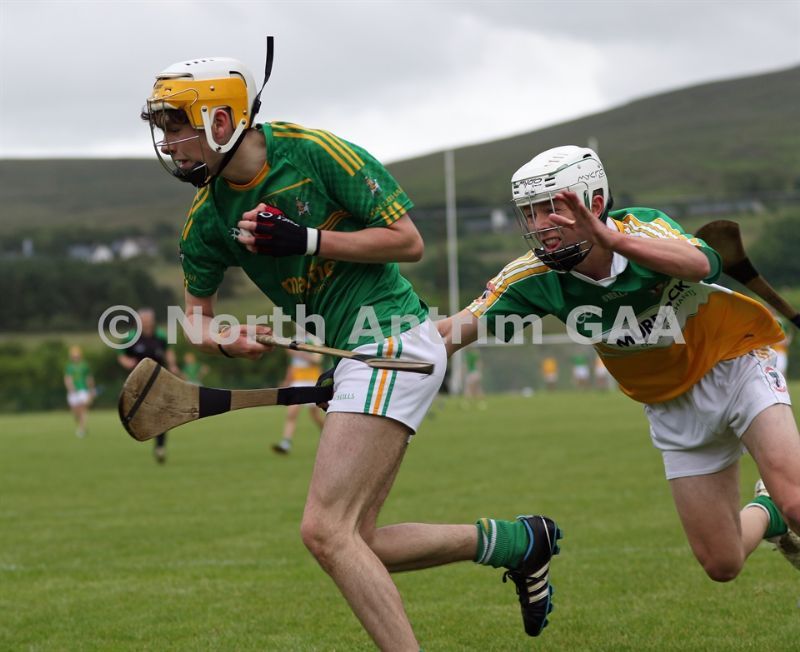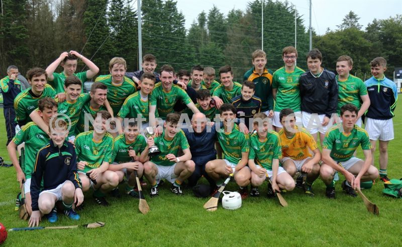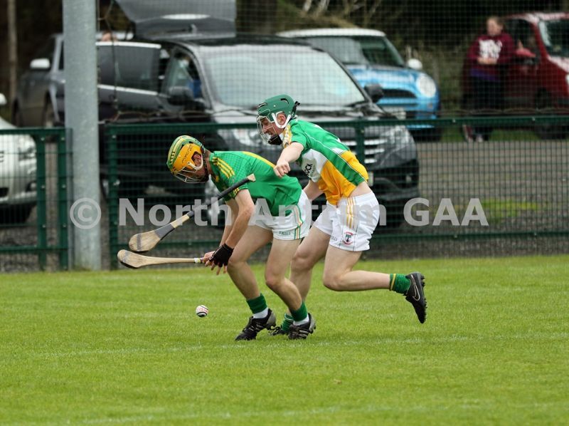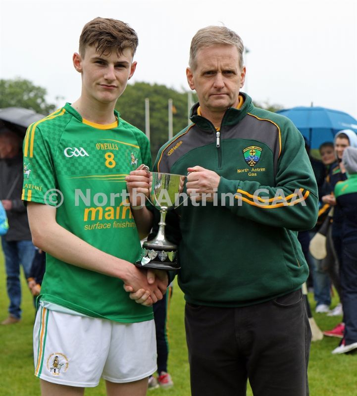 • North Antrim GAA Chairmain Owen Elliott presenting McMullan Cup Final Captain Aaron Crawford with the McMullan Cup Final Trophy