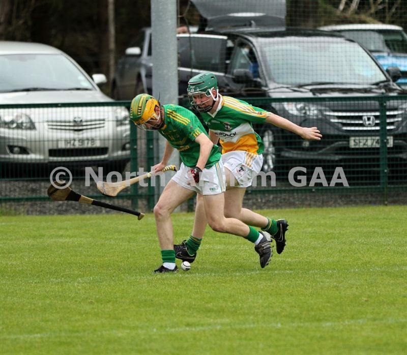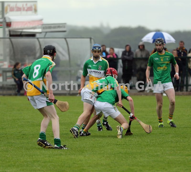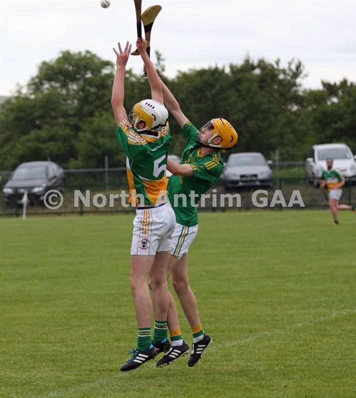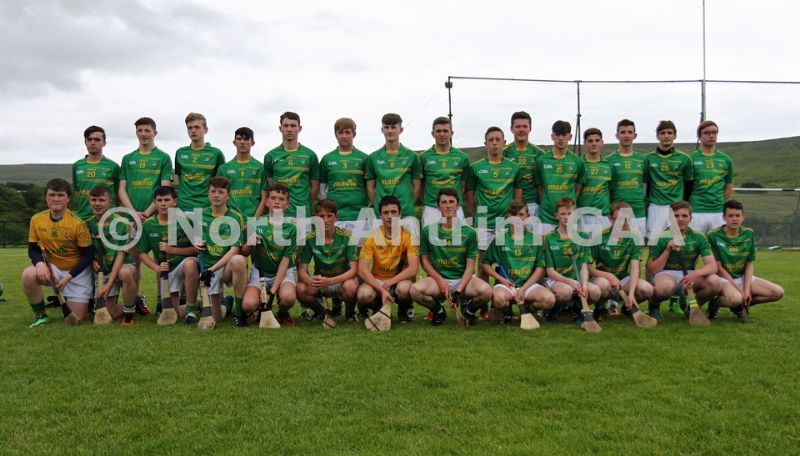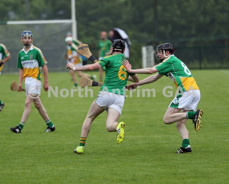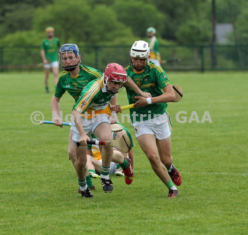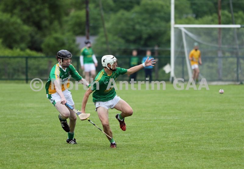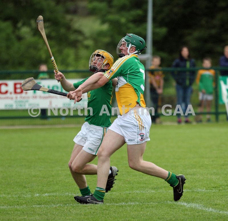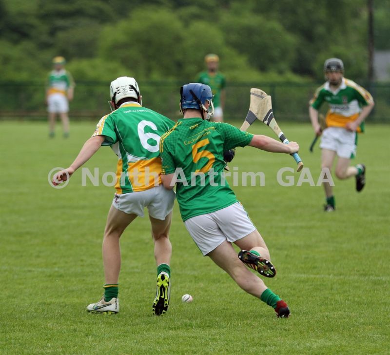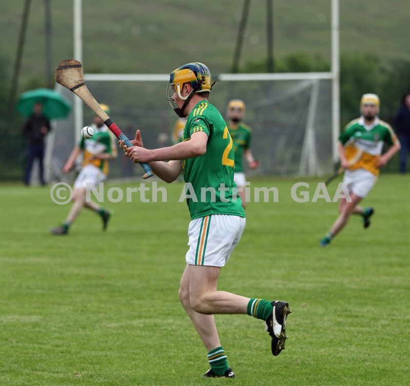 • North Antrim GAA Chairmain Owen Elliott presenting McMullan Cup Final Captain Aaron Crawford with the McMullan Cup Final Trophy