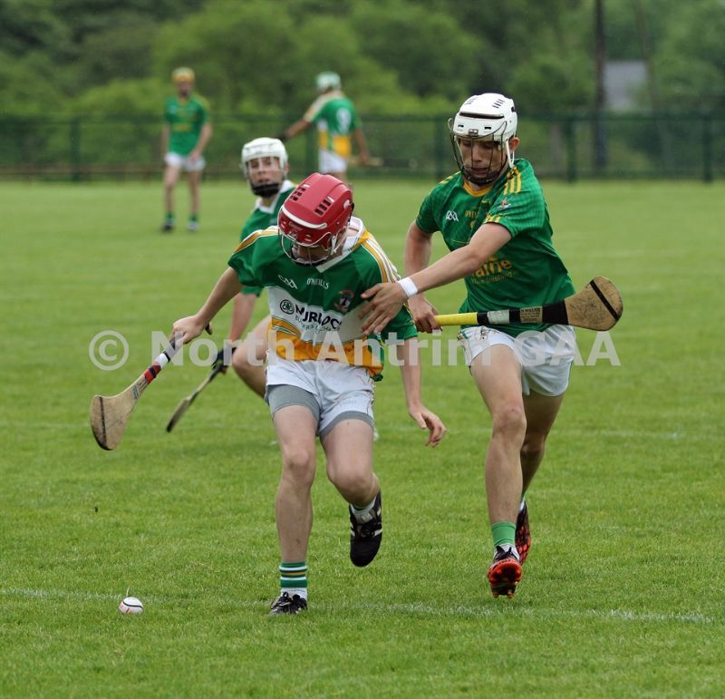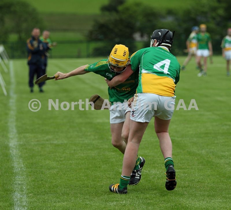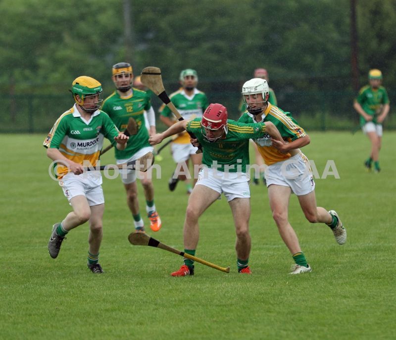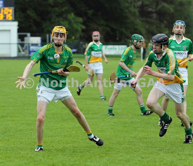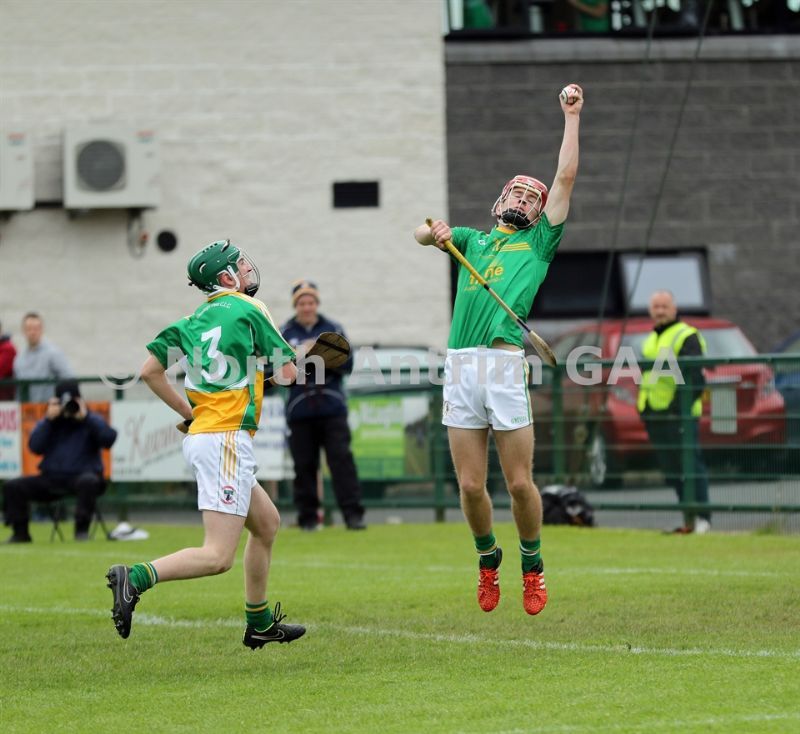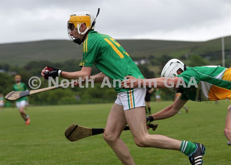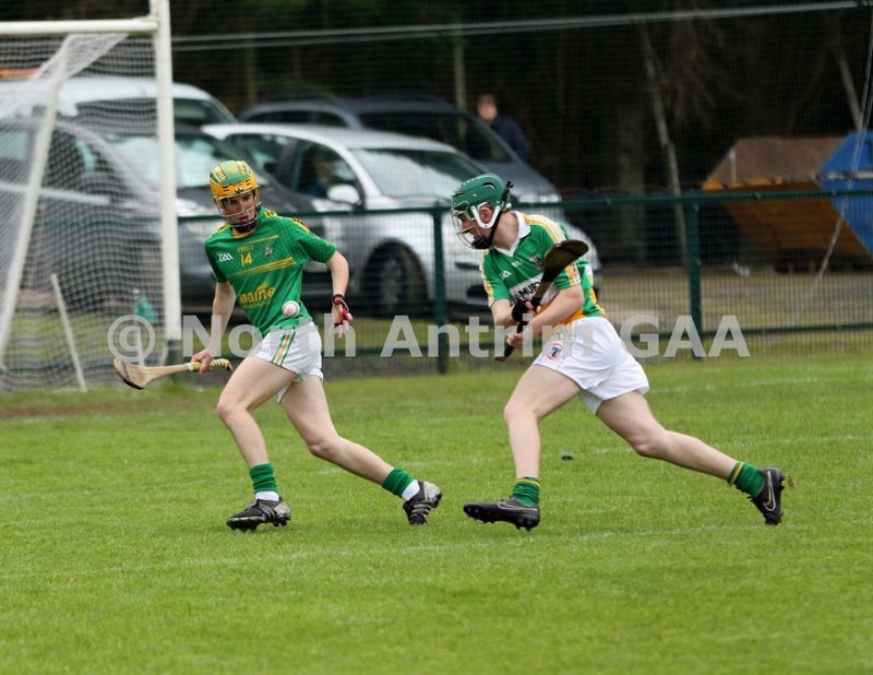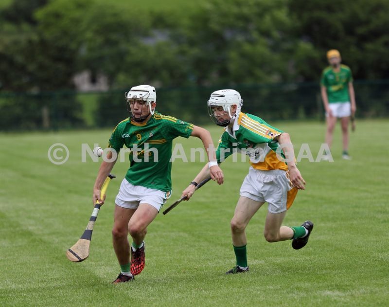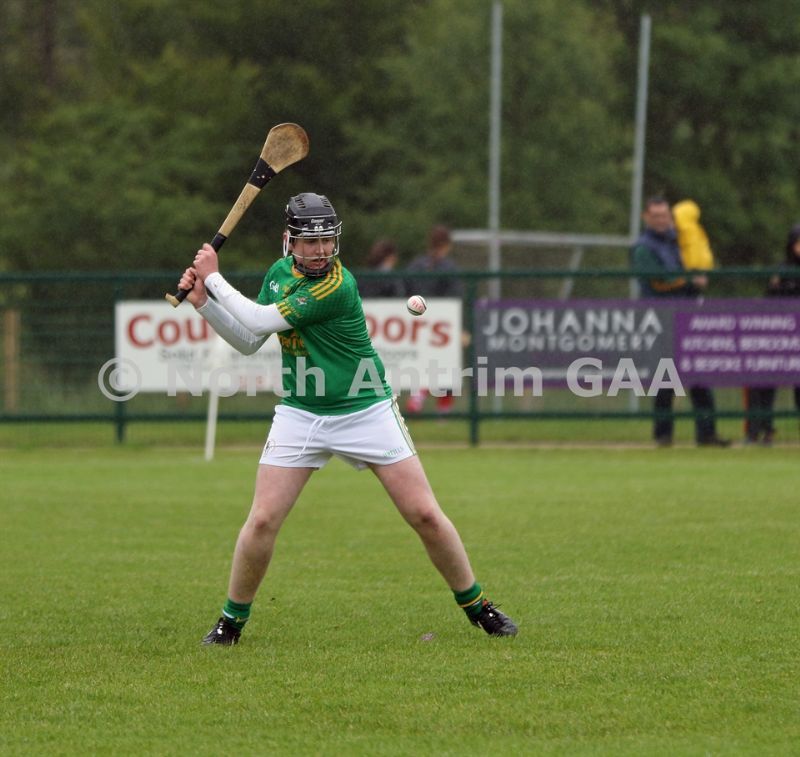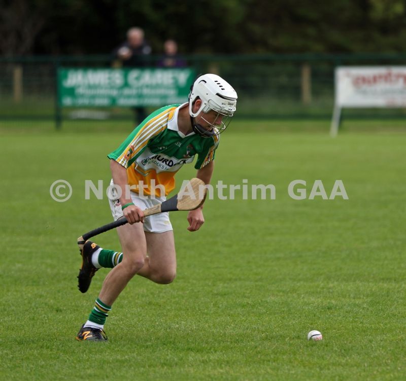 • North Antrim GAA Chairmain Owen Elliott presenting McMullan Cup Final Captain Aaron Crawford with the McMullan Cup Final Trophy