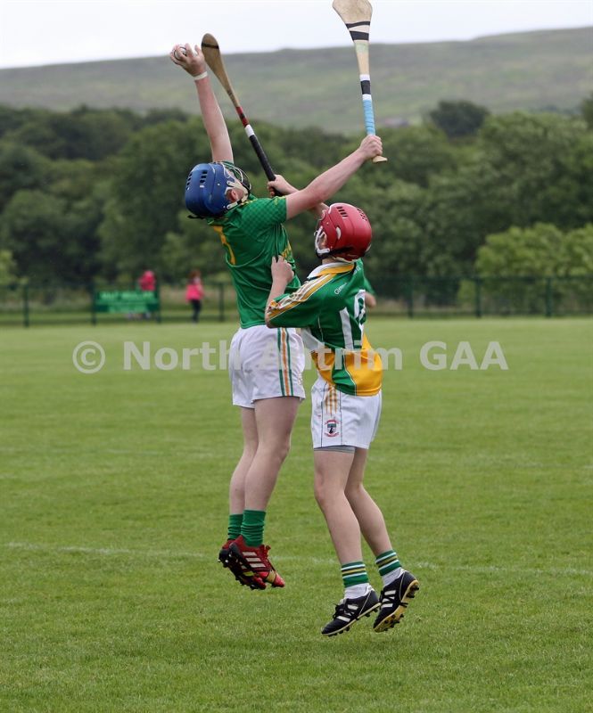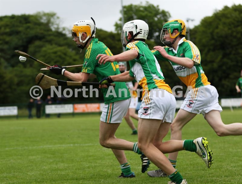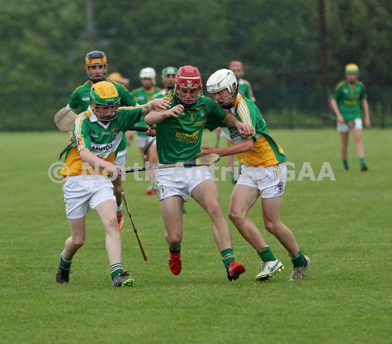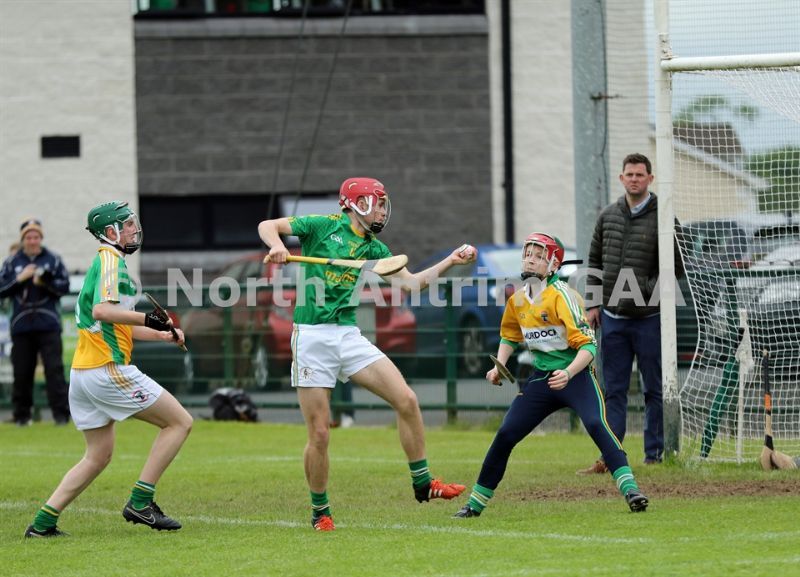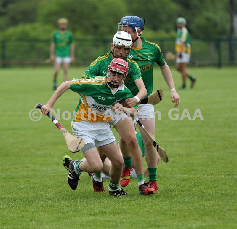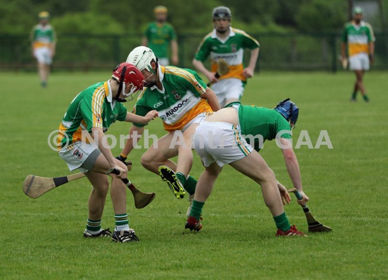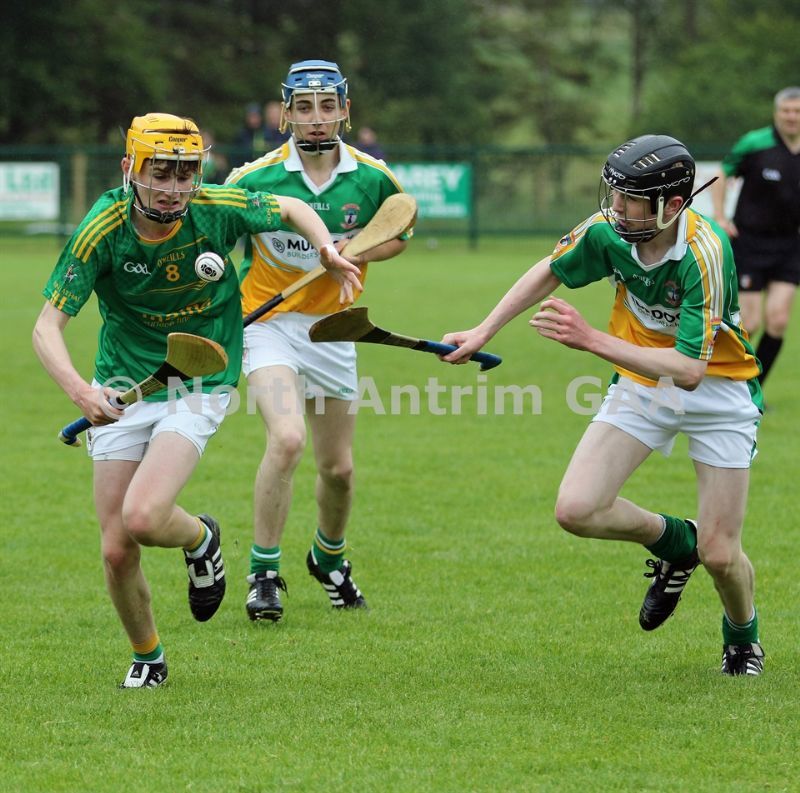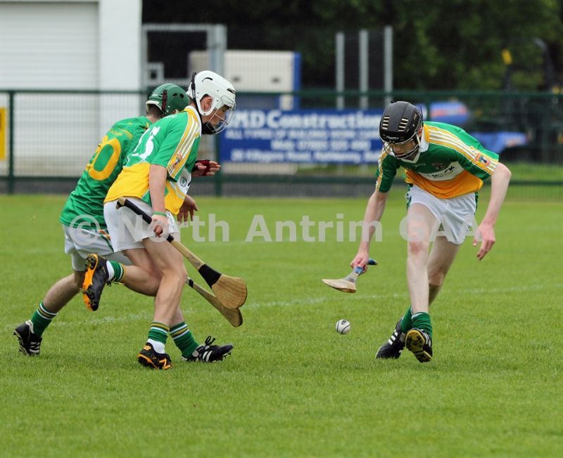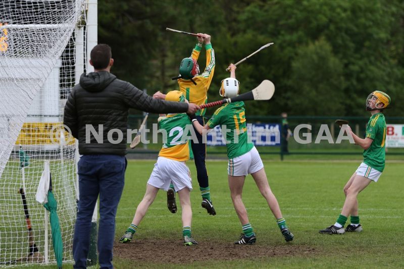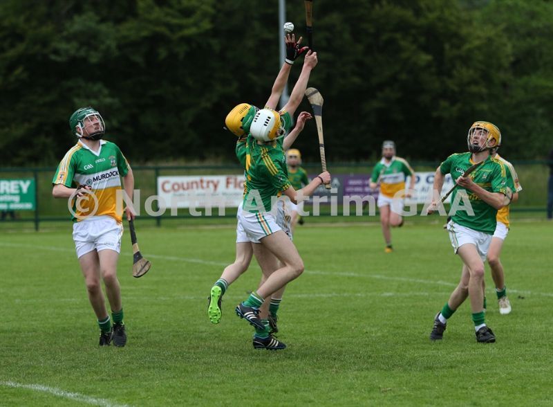 • North Antrim GAA Chairmain Owen Elliott presenting McMullan Cup Final Captain Aaron Crawford with the McMullan Cup Final Trophy