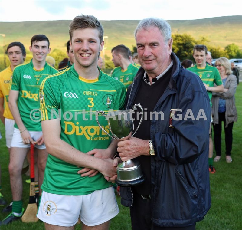 • Malachy Darragh presentring Dunloy Cuchullians captain Conor Kinsella with the Darragh Cup Trophy