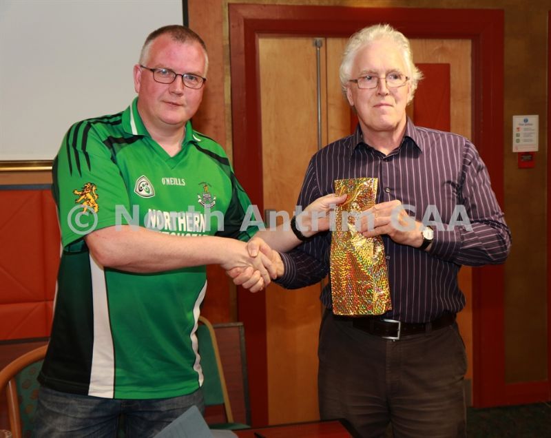 • North Antrim Cultural Officer James Gaston presenting Quiz Master Paul Fitzpatrick with a small token