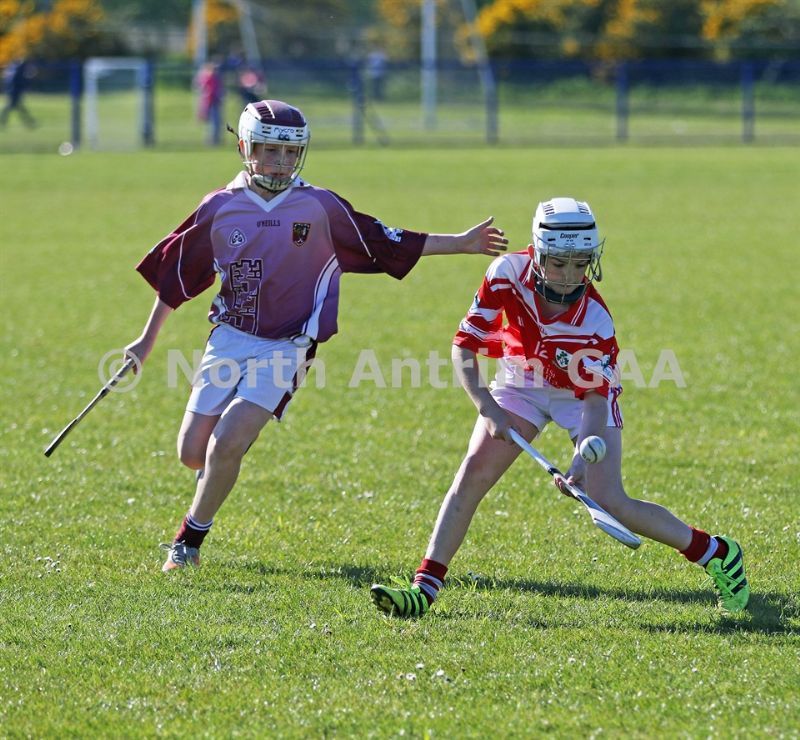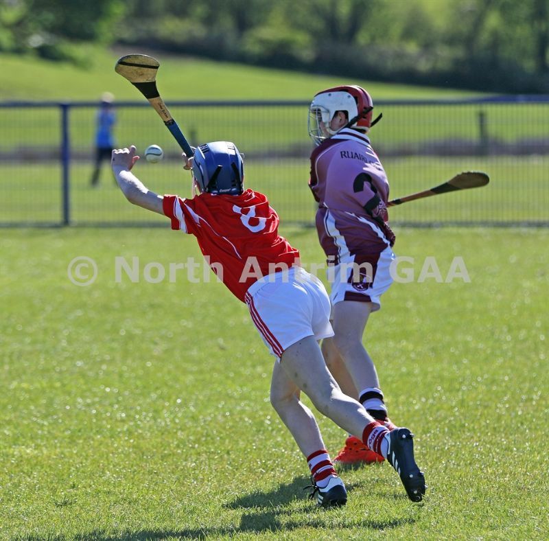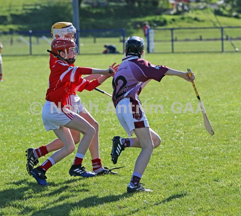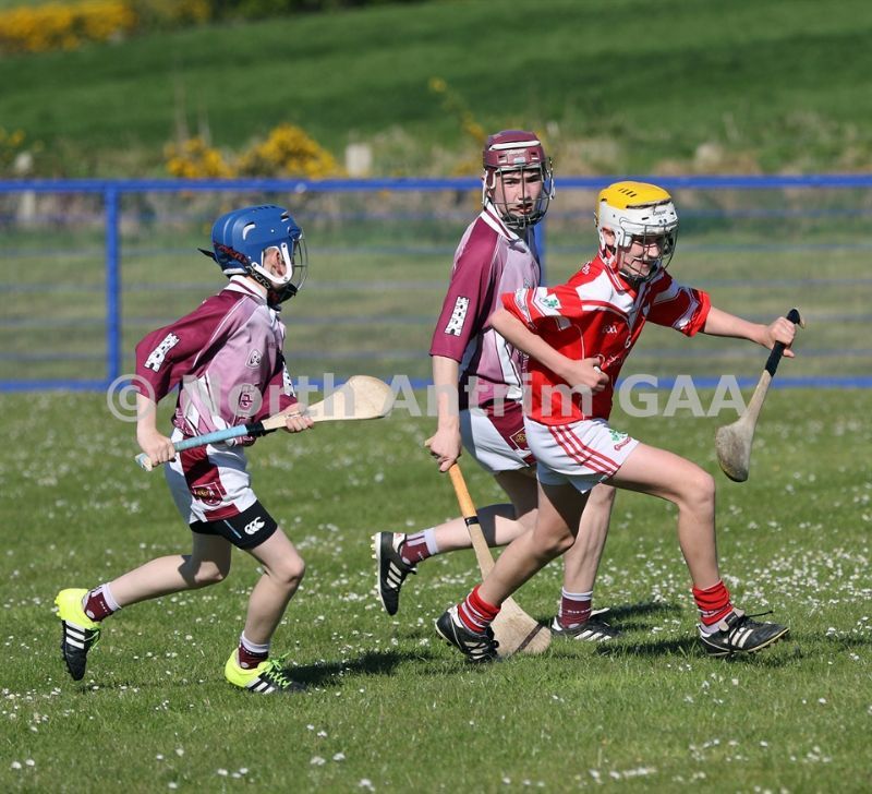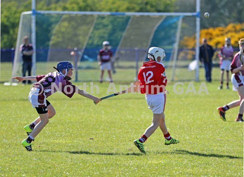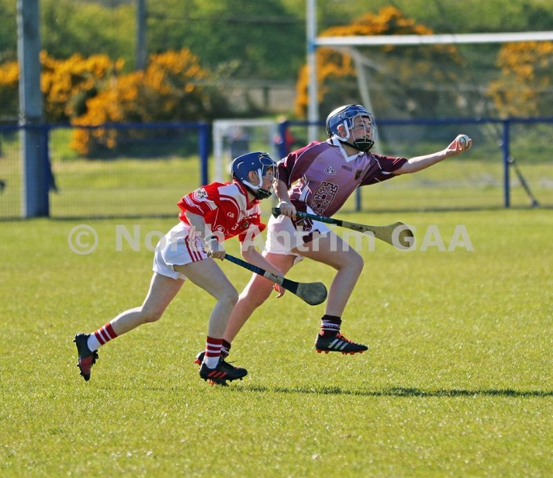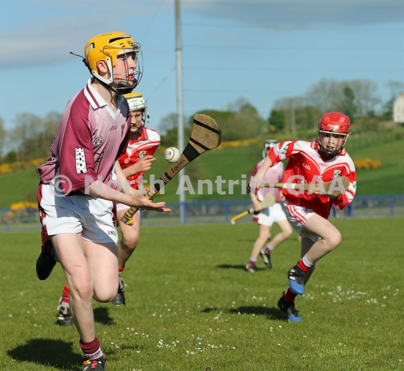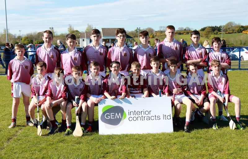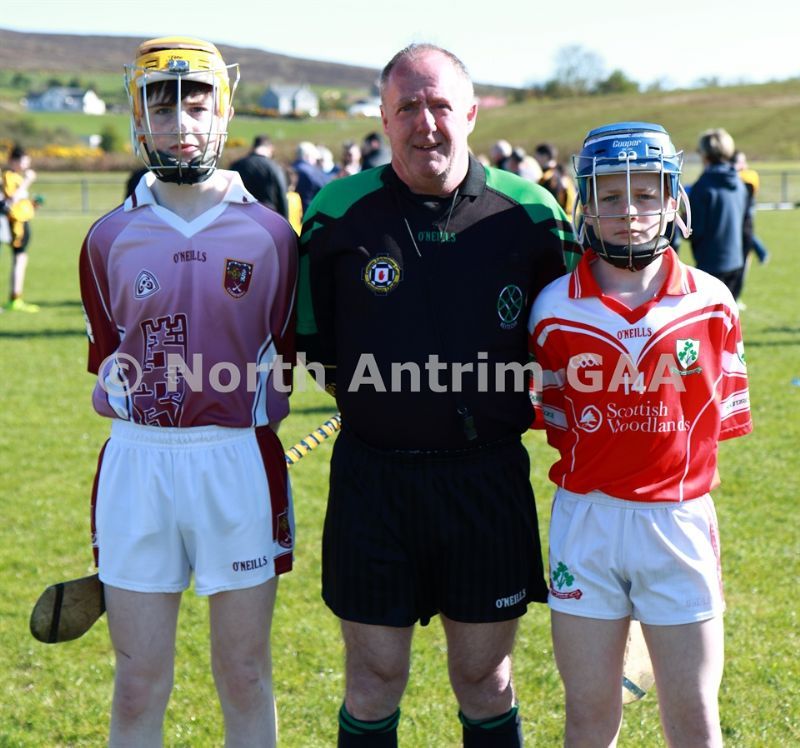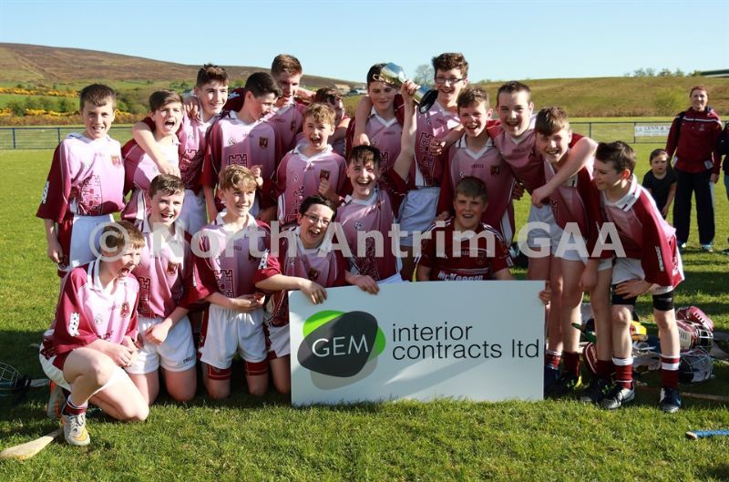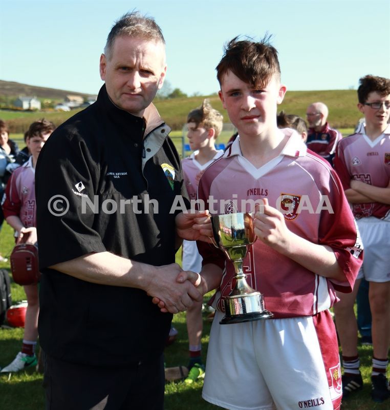 • North Antrim GAA Chairman Owen Elliott presenting Ruairi Og Captain Fiontan McQuillan with the TeamKit U14 Feile A Trophy