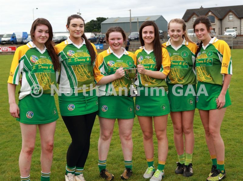 • North Antrim GAA Chairmain Owen Elliott presenting Cuchullians Dunloy captain Katie Laverty with the U16 Feis Camogie Trophy