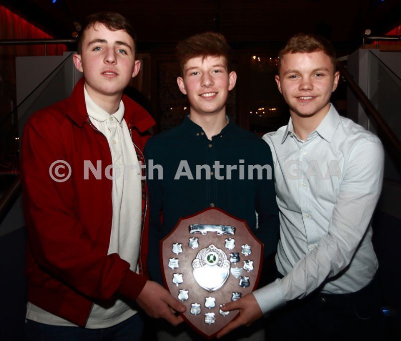 • Martin Braniff, Conor Jones and Aaron Monaghan of Loch Mor dal gCais who received the Under 16B Championship Cup at the North Antrim awards dinner in the Central Bar, Ballycastle.