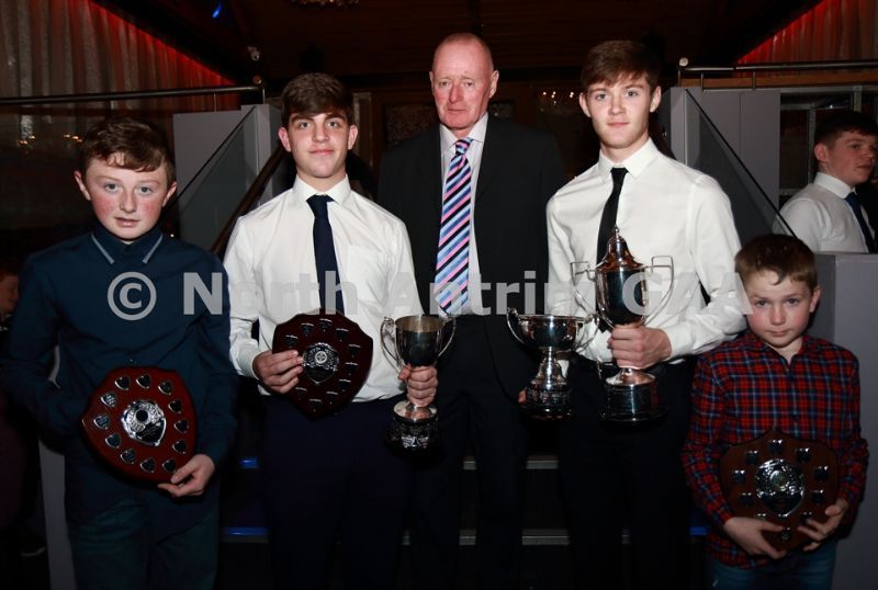 • North Antrim County Delegate Sean McKendry with Loughgiel juvenile players who received awards at the North Antrim dinner. L,R, Rory McCormick (U14 Airbourne), Cathal Hargan (U16 League), Michael McGarry (U16 Championship), Daniel O’Mullan (U10 Indoor)