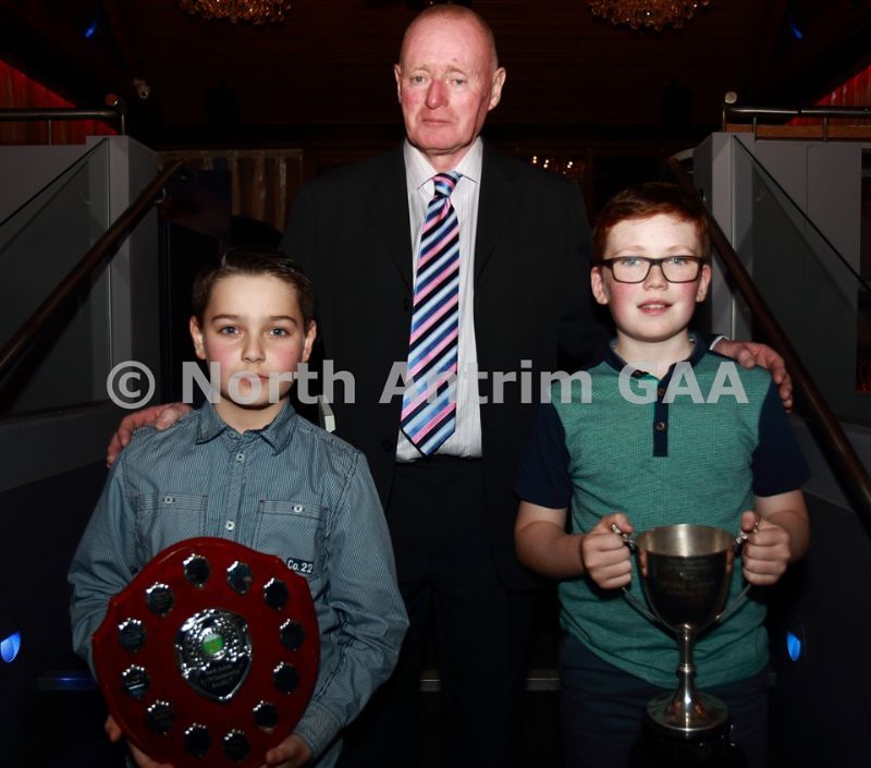• North Antrim County Delegate Sean McKendry with Dermot McManus (U10 Div1) and Oran McCambridge (U10 Div3) of Ruairi Og Cushendall
