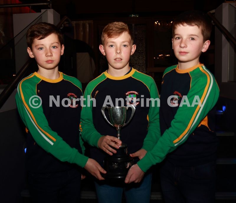 • Members of the Glenariffe Oisin highly successful U12 team Patrick McIlwaine, Brogan O’Connor and Oran Leech with the Under 12 Championship Cup at the North Antrim dinner