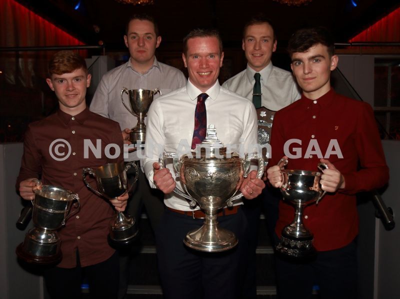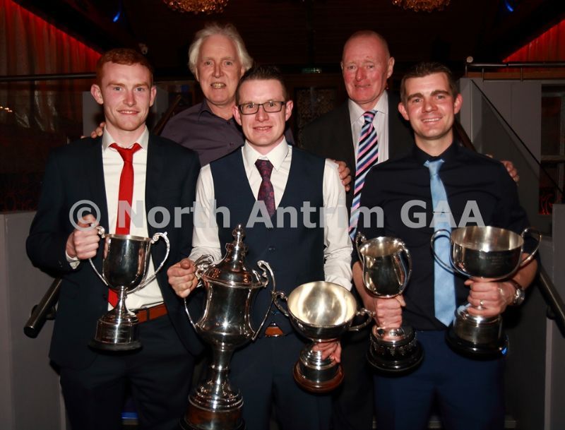 • North Antrim Cultural Officer Jimmy Gaston and Sean McKendry with Loughgiel Shamrocks players who received awards on behalf of their teams. L-R, Gillan (Senior Reserve Championship), Shay Casey (Senior Feis Cup and Division 1 League), C (Junior League and McCaughan Cup)
