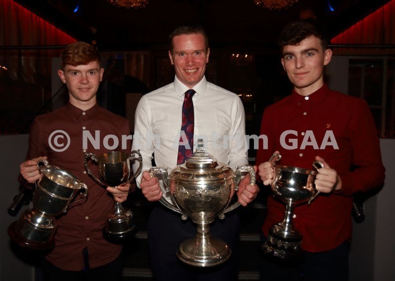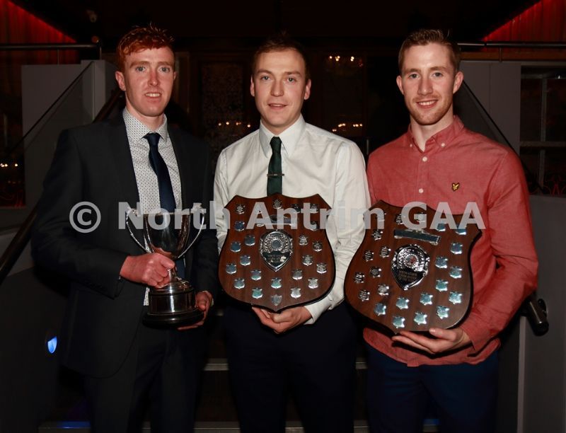• Dunloy Cuchullains who this year completed a treble success winning Minor, Under 21 and Senior Championship trophies. Pictured receiving the awards at the North Antrim dinner are, L-R, Liam McCann (Minor), James McKeague (Senior) and Ryan Elliott (U21)