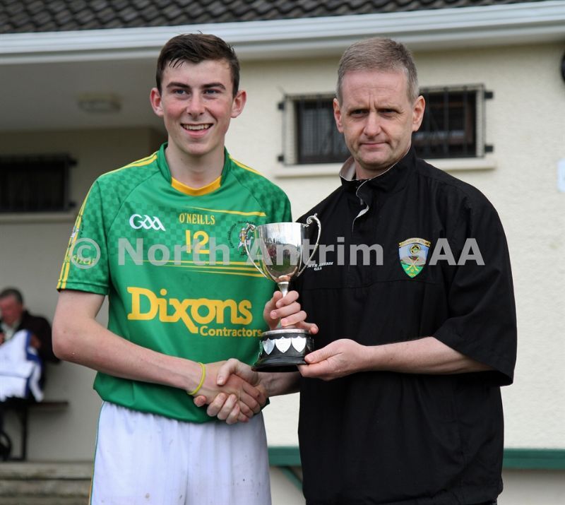 • Cuchullians Dunloy Team Captain Declan Smyth pictured with North Antrim GAA Chairman Owen Elliott