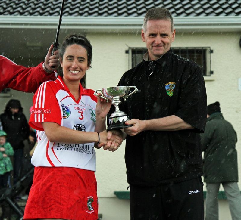 • Loughguile Shamrocks Team Captain Cara McIntyre pictured with North Antrim GAA Chairman Owen Elliott