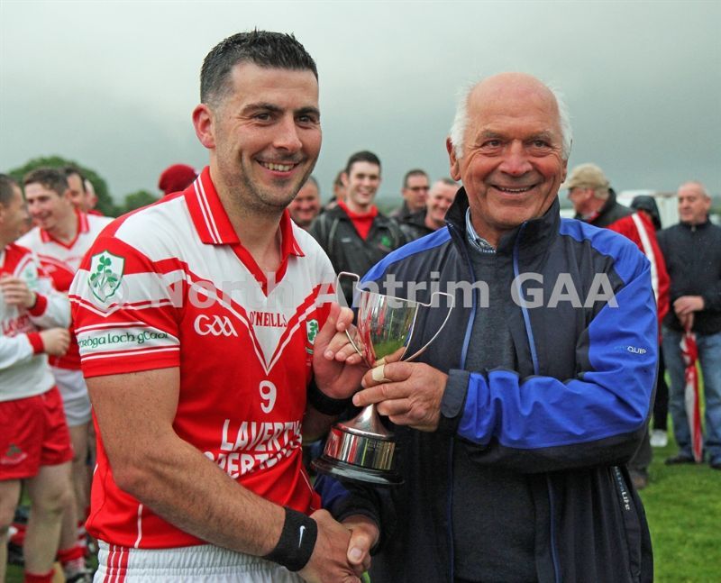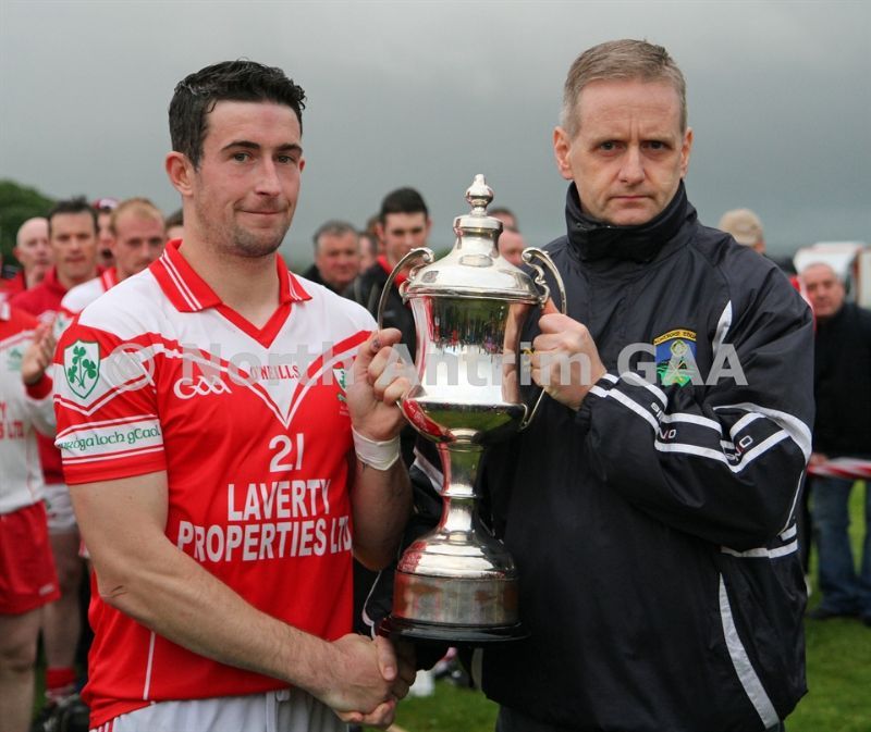 • North Antrim Chairman Owen Elliott presents the Senior Feis Cup to Loughgiel Captain Eddie McCloskey