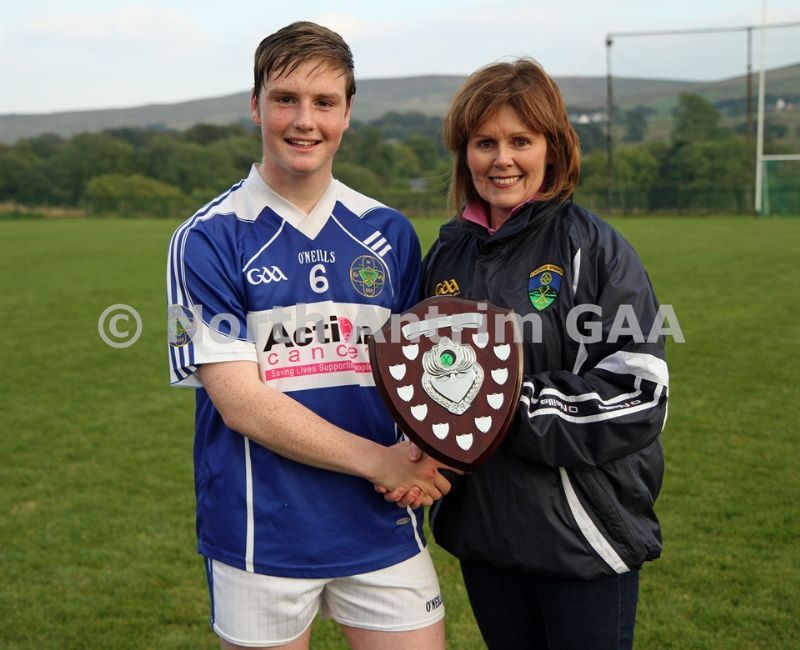 • North Antrim Secretary Mary Kane presenting Tir Na Nog team captain Decky Mallon with the North Antrim U16B Shield