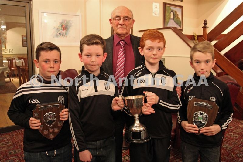 • Former North Antrim Treasurer Harry Connolly with All Saints players who picked up awards at the North Antrim dinner in the Glens Hotel.  L-R, Ciaran McQuillan (Under 10 Shield), Aidan McGarry and Kevin O'Boyle who accepted the Senior Feis Cup Football Cup and Niall Devine (Under 10 Indoor Hurling Shield)