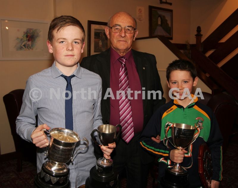 • Former North Antrim Treasurer Harry Connolly presents the Feile B Cup to Higgins (left) and the Under 12 B Shield to Thomas O'Kane of Con Magees Glenravel
