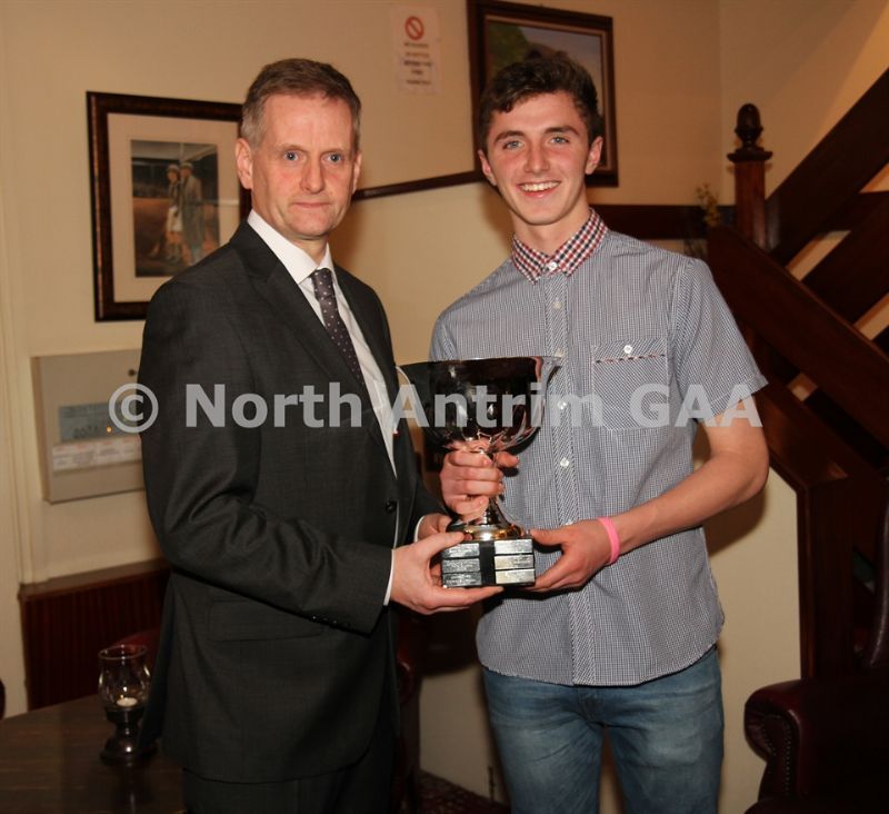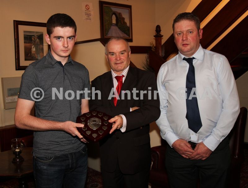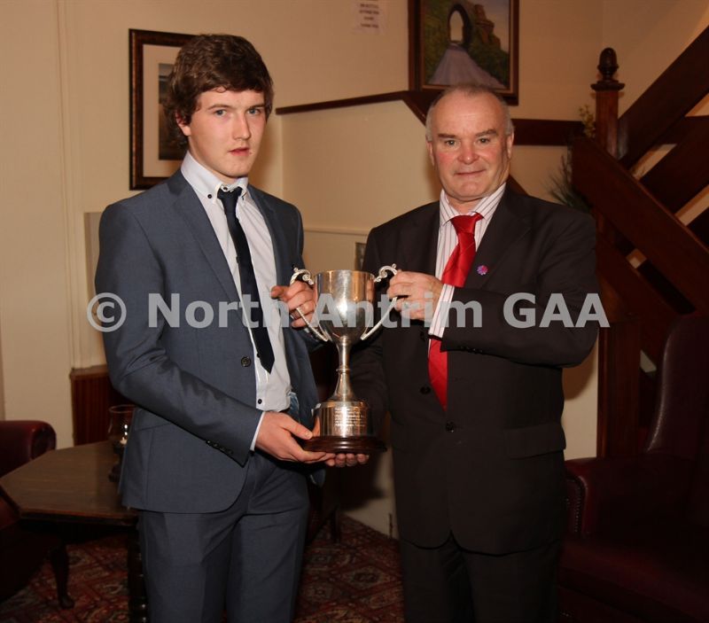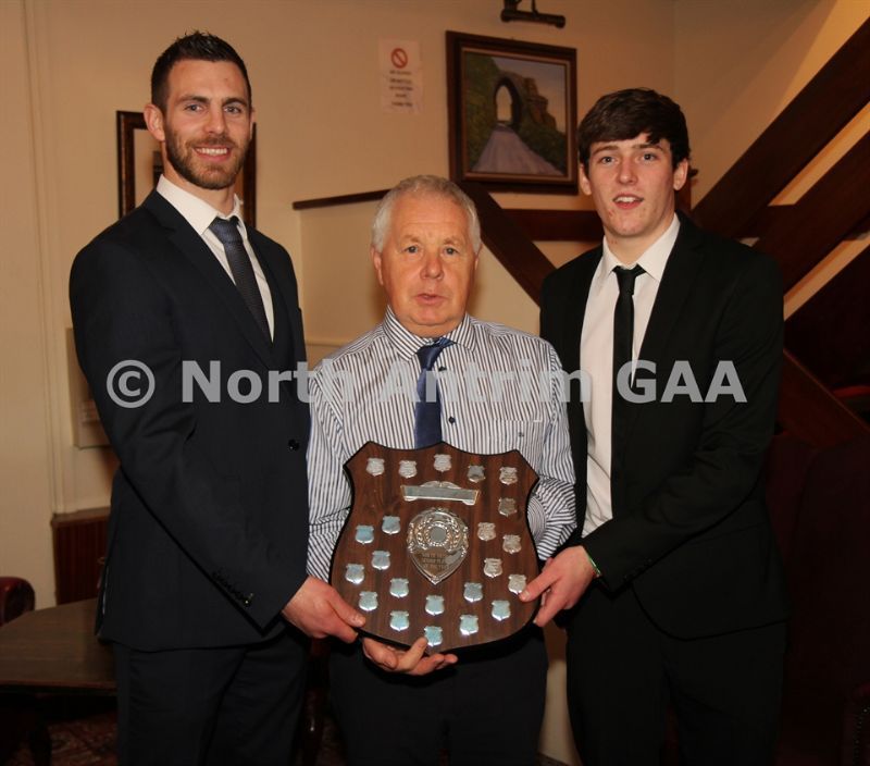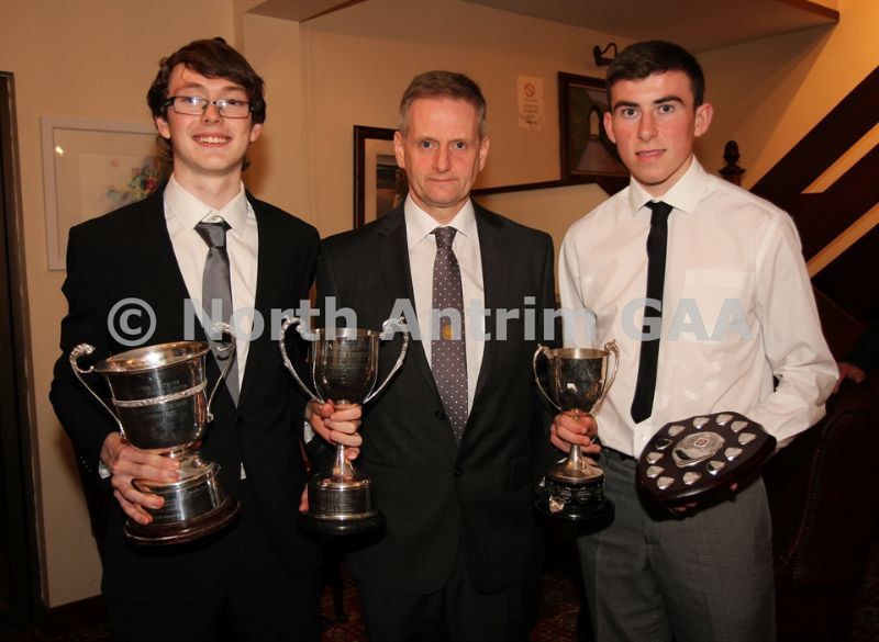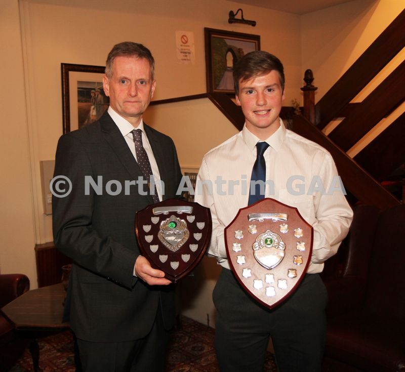 • North Antrim Chairman Owen Elliott presents the North Antrim Intermediate Hurler of the Year to Conor Small and the North Antrim Junior Hurler of the Year to Declan McKay