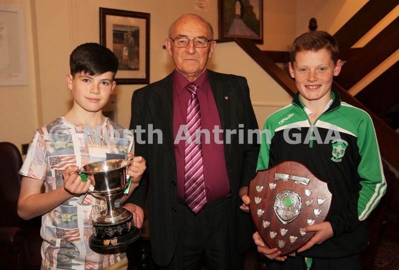 • Former North Antrim Treasurer Harry Connolly presents the Under 12 Championship cup to Oisins captain Shea McDonnell and the Under 10 Championship Cup to Patrick McIlwaine
