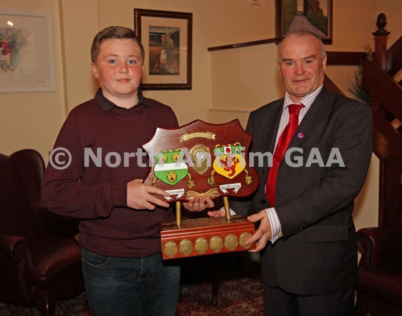 • North Antrim Chairman Owen Elliott presents the North Antrim U16B Championship and U16B Shield to Declan Mallon of Tir na nOg, Randalstown
