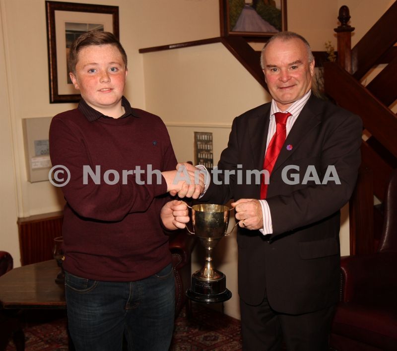 • Antrim County Vice-Chairman Joe Edwards presents the U14 Championship Cup to Loughgiel captain Declan McCloskey
