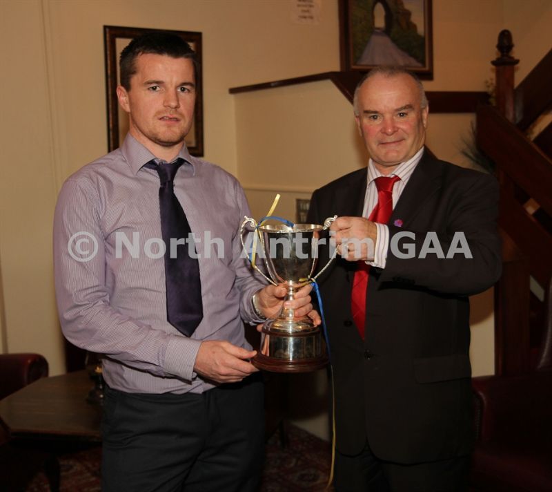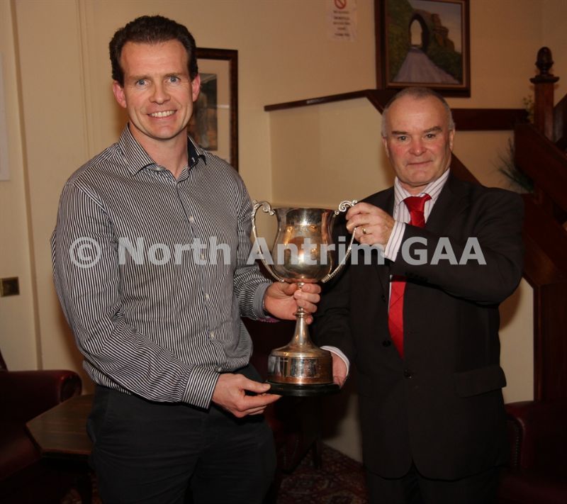 • Antrim County Vice-Chairman Joe Edwards presents the Junior Hurling Championship Cup to Declan McKay of St Mary's, Rasharkin