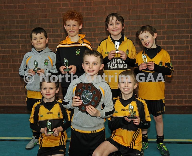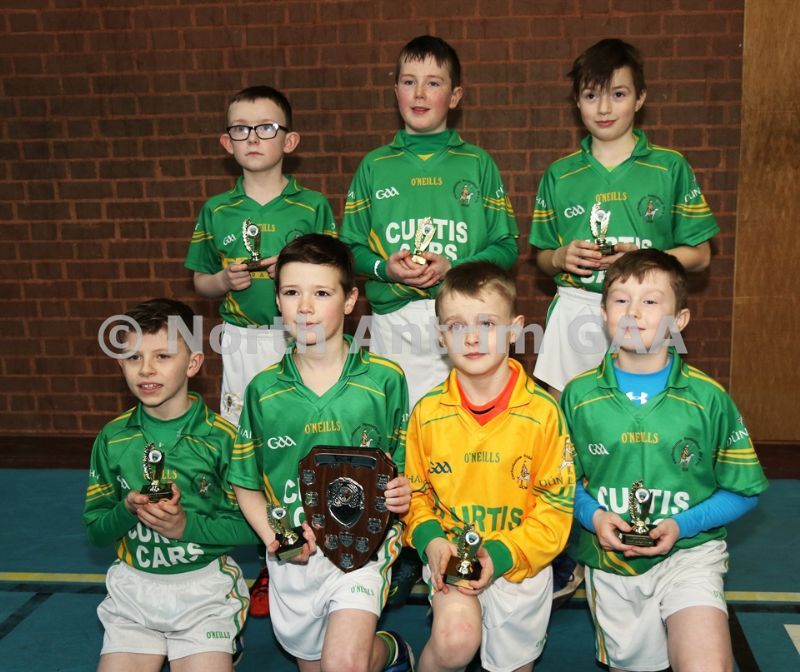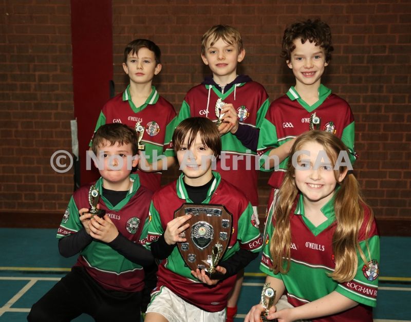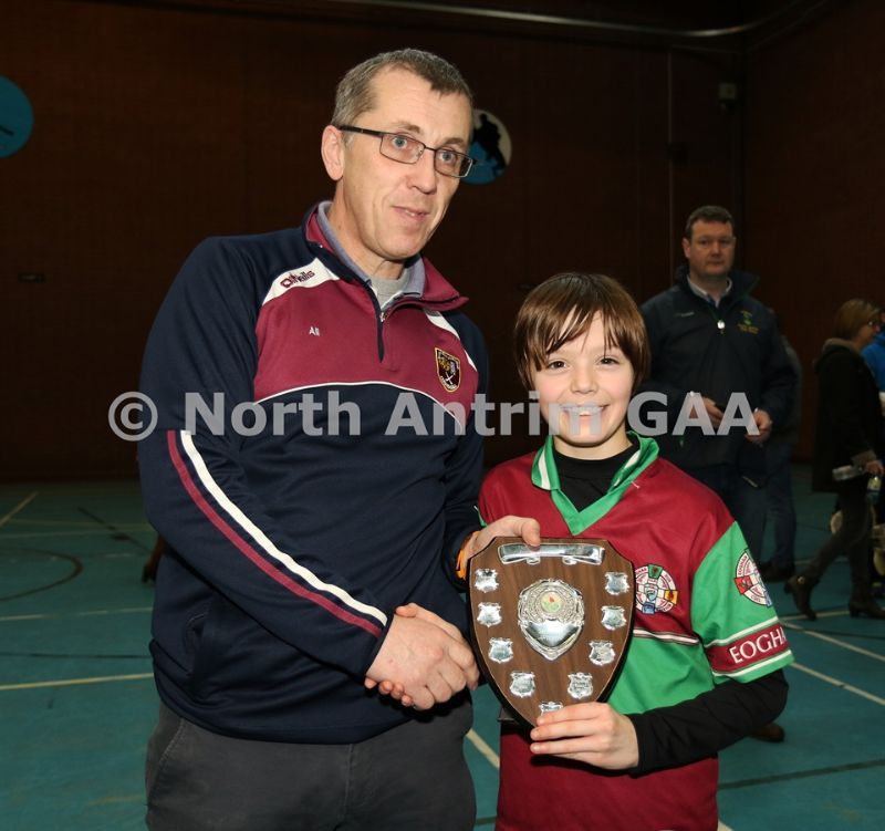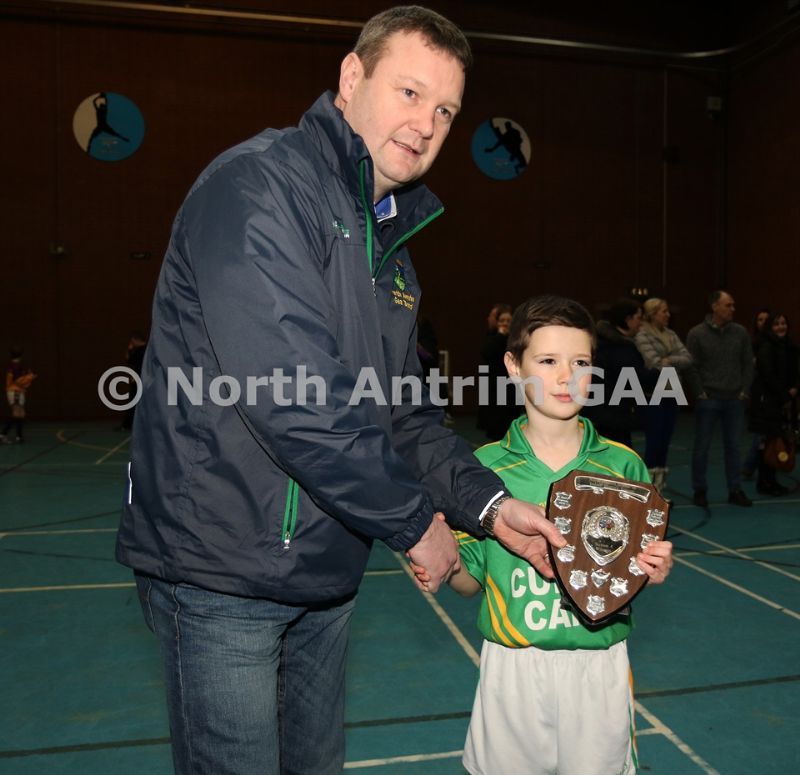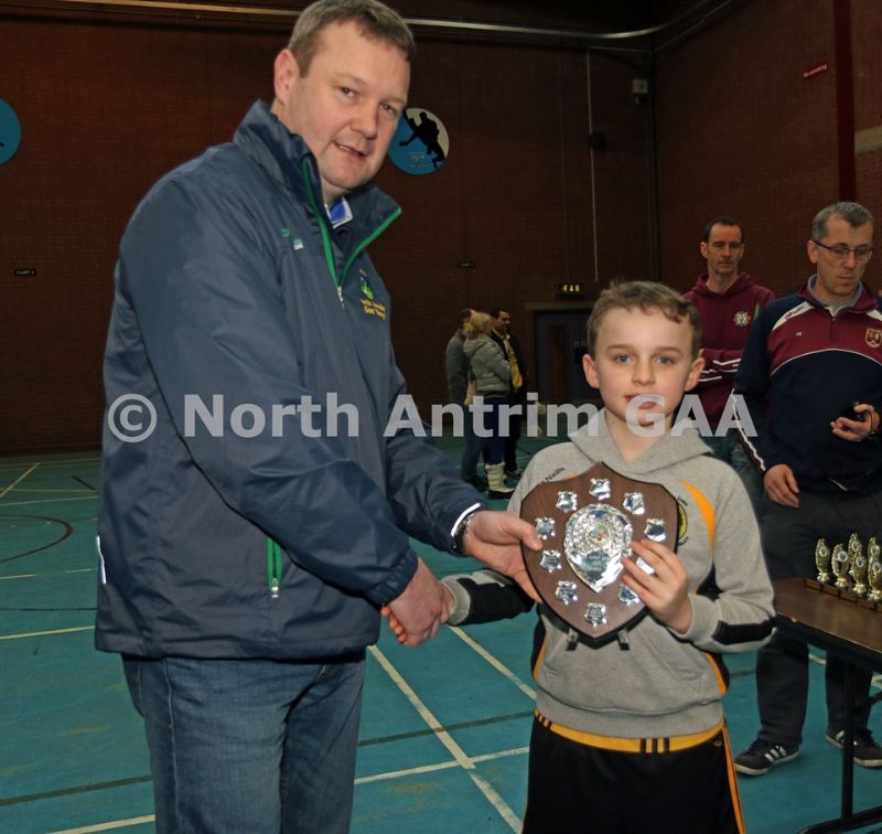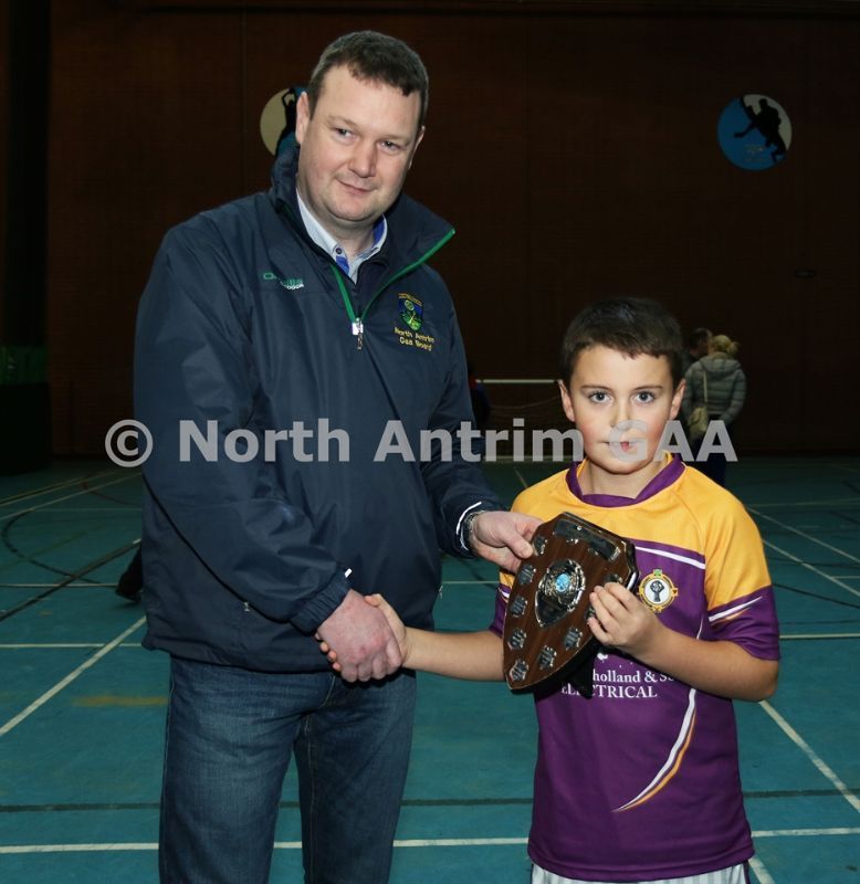 • North Antrim Fixtures Secretary Alistair Mc Cambridge presenting Owen Roe team captain Oisin Hasson with the North Antrim U10 Division 3 Indoor Hurling League Shield