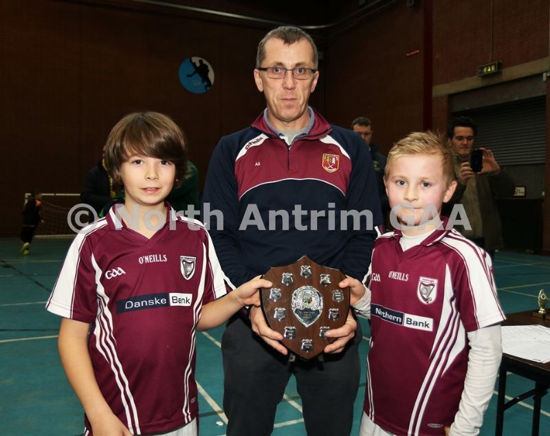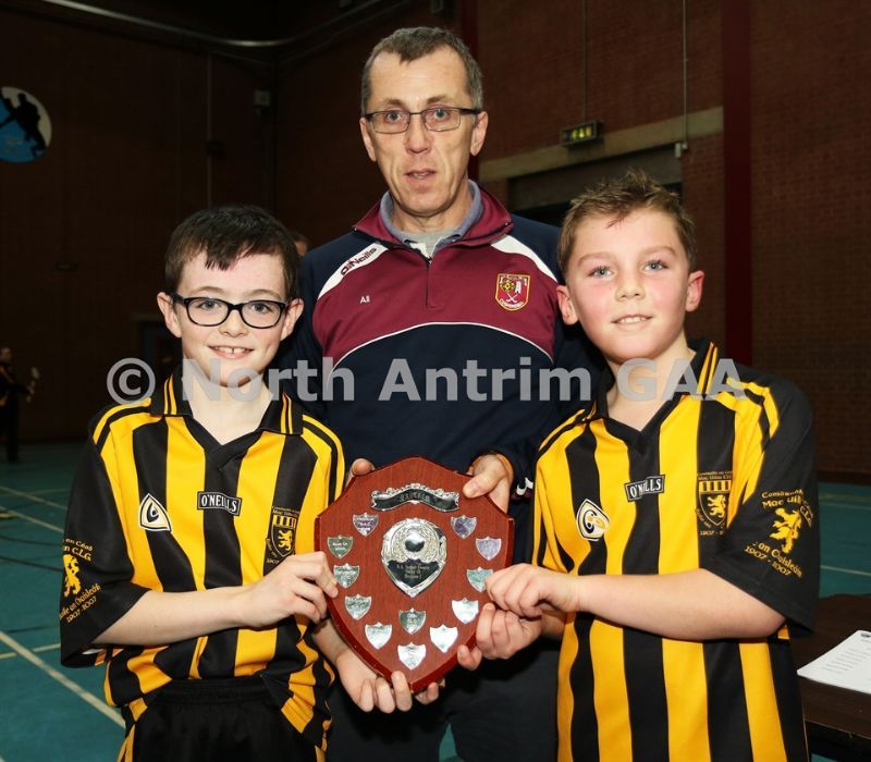• North Antrim Fixtures Secretary Alistair Mc Cambridge presenting McQuillans team captains Cathaoir Donnelly and Kane Bowden with the North Antrim U10 Division 1 Indoor Hurling League Shield